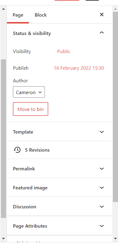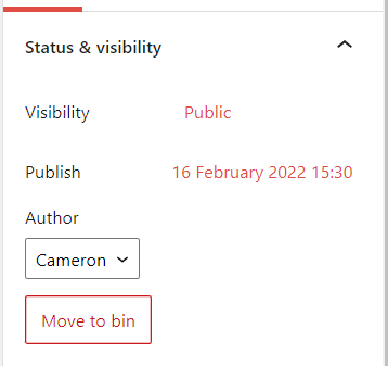 This area will just give you some general details around the page including the Visibility level, when it was created and who created it. You can then delete the page from here by clicking on Move to Bin.