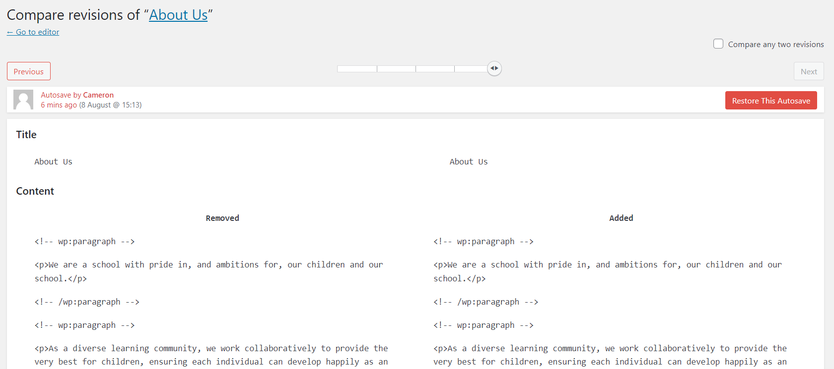 Here, you can turn back time on this particular page to either undo a mistake that was made during an edit, or simply roll it back if you had made a seasonal change for example.