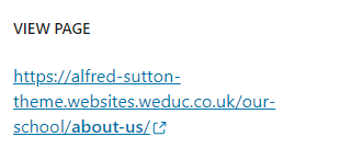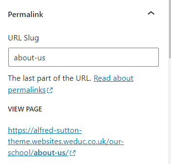 From here, you can see the slug for this page, this is part of the web address visitors will see when they visit this page. You can edit this to a custom one if preferred, by default it will be created based on the Title of the page.
