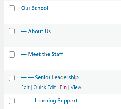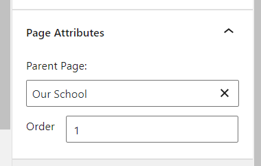 With every page, you will need to select a Parent and an Order position. In the below example, the page British Values has the parent set as About Us and the Order as 1. Whilst Club Booking has the parent as Admin and the Order as 2.