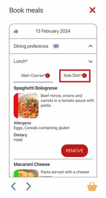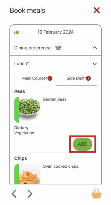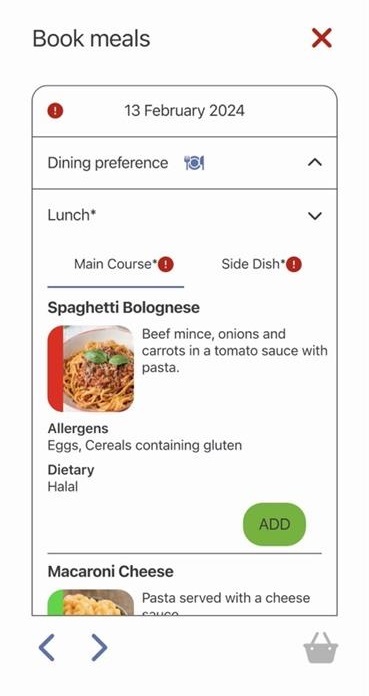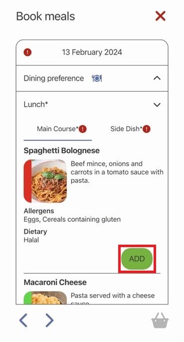6) Select the menu items you would like by tapping ADD next to the item. You may need to browse between lunch and breakfast options, or between courses such as main course and side dish. If a meal course e.g. main course, is flagged with an asterisk, this means a selection must be made for this course. The red exclamation mark indicates you still need to make a selection.