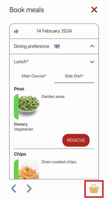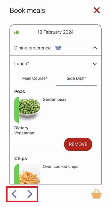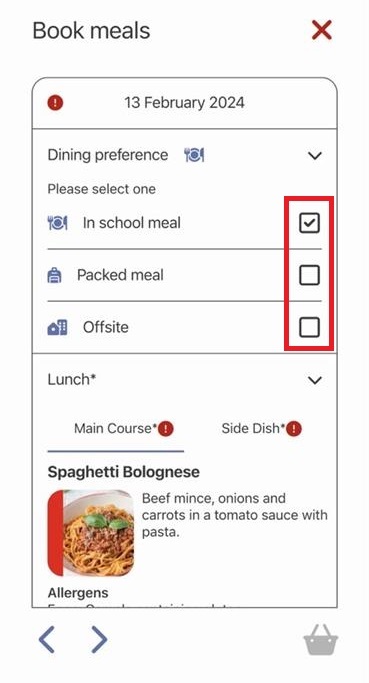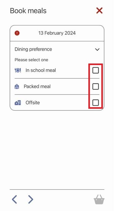 a. The Dining preference has not been pre-set for the day shown. Select the dining preference you require e.g. In School Meal.