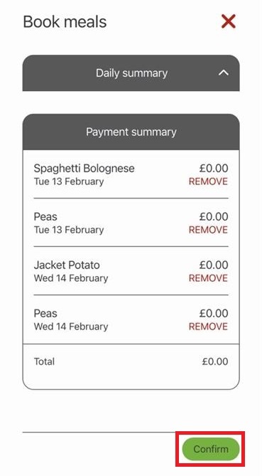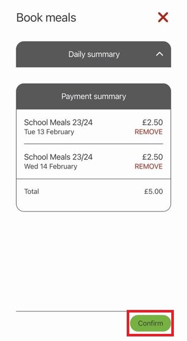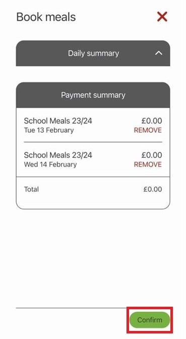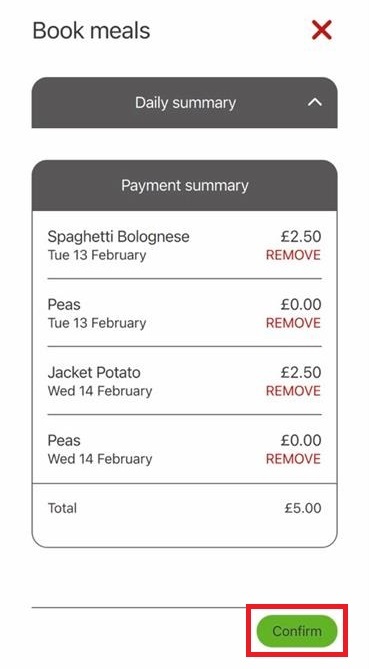 9) Review the payment summary and select Confirm. You will not be charged here, regardless of the total cost in the payment summary. This may be because your school meals are free, or may be because you pay for school meals via a separate payment system.
