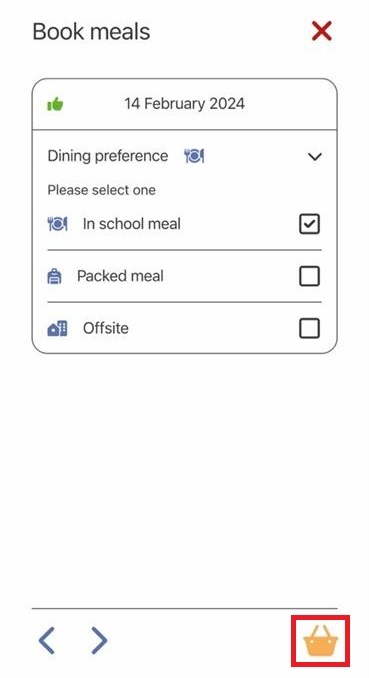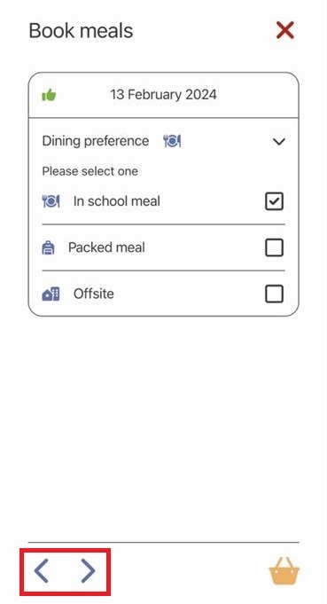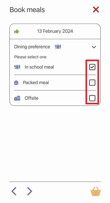 b. The Dining preference you require has been pre-set for the day shown, but you can change this if you wish e.g. if it is set to Packed Meal, you can select the In School Meal option.