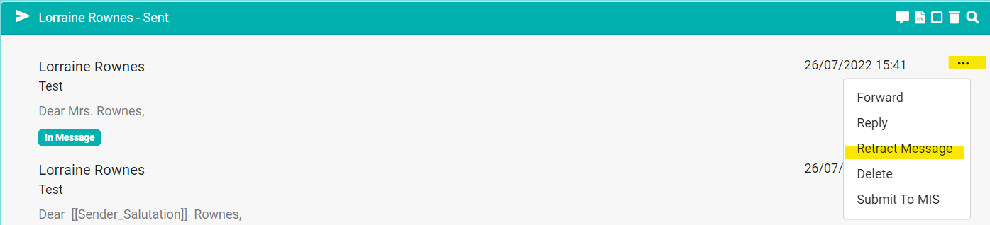Find the message the needs to be recalled, and click the 3 dots on the right hand side., select Retract Message