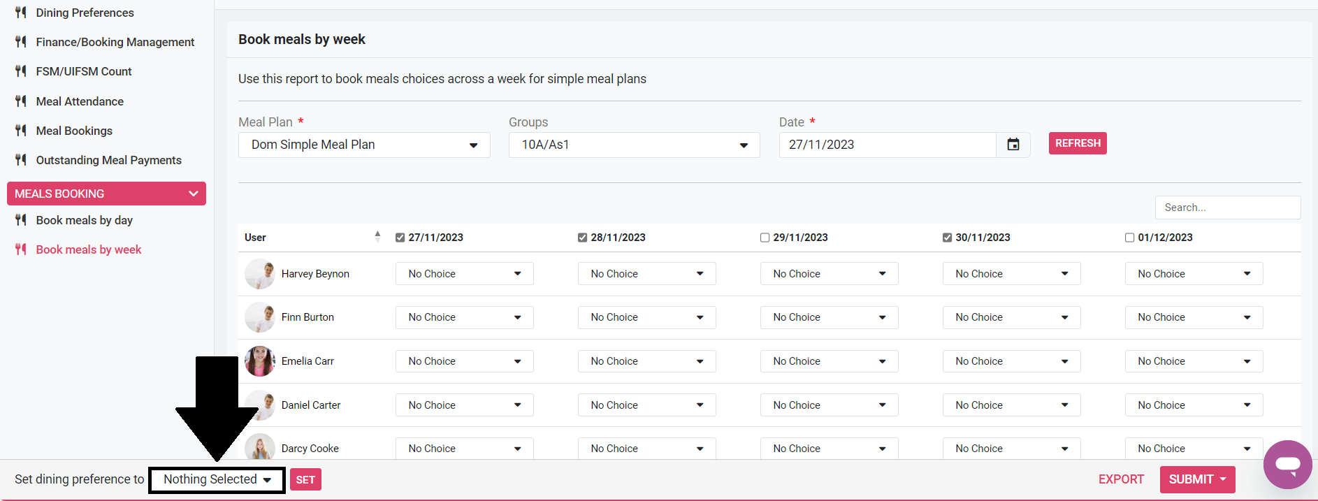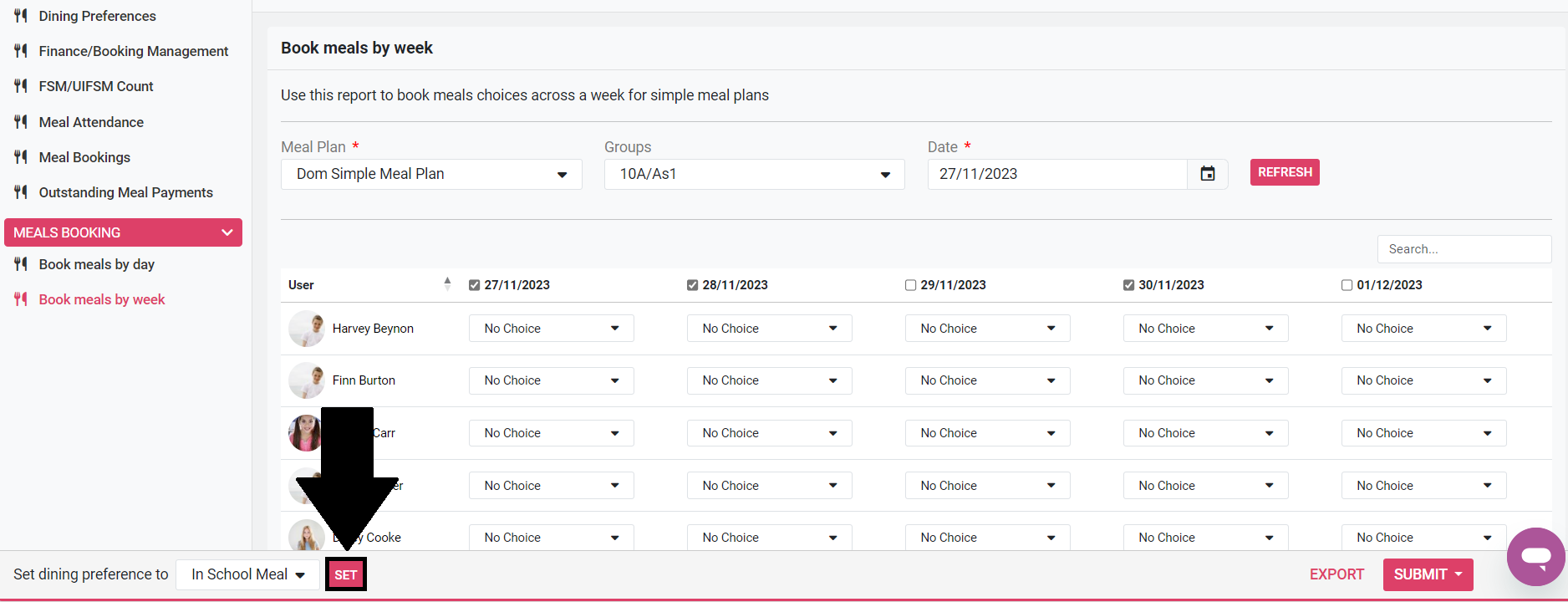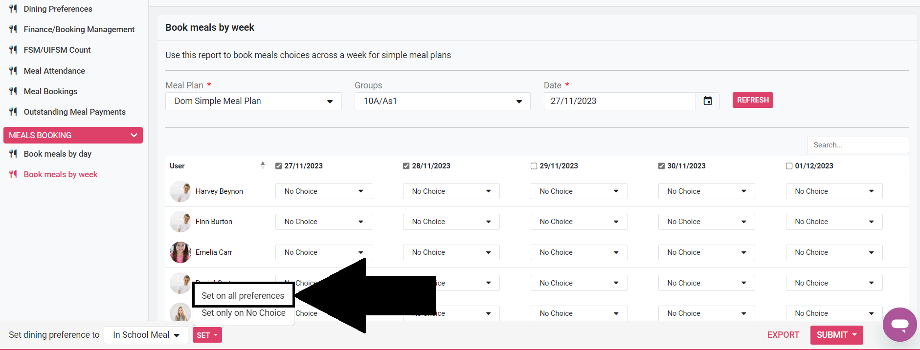 13 a) If you want to apply this dining preference to all students in the group for the days you have ticked, click Set on all preferences. *Please be aware that this will override any existing dining preferences that are set, including those pre-set via a student's School Meal Pattern.*
