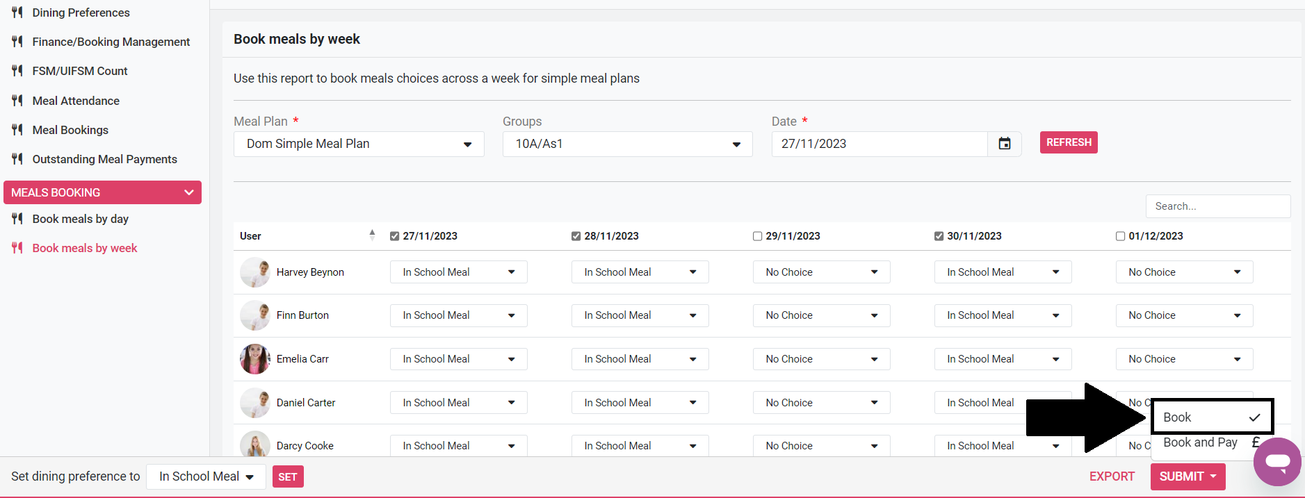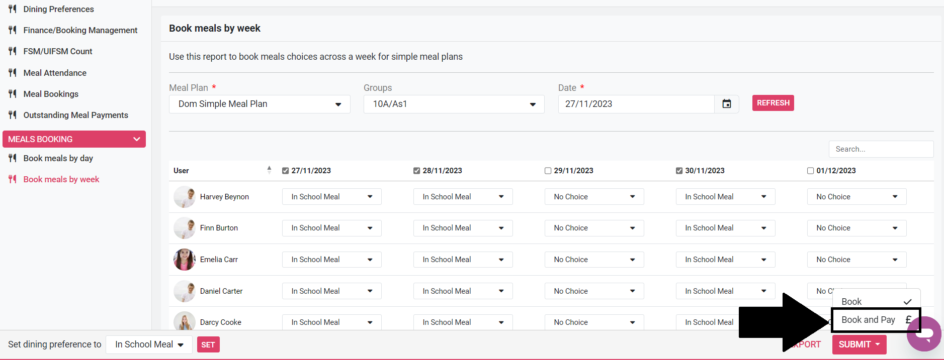 16 b) If you wish to charge for In School Meals now, click Book and Pay. This option will confirm the meal booking and where applicable will also deduct the necessary funds from the student’s meal purse. If a student does not have enough available funds, then the meal will still be booked but a payment failure error will be displayed in a notification panel at the top of the user table.