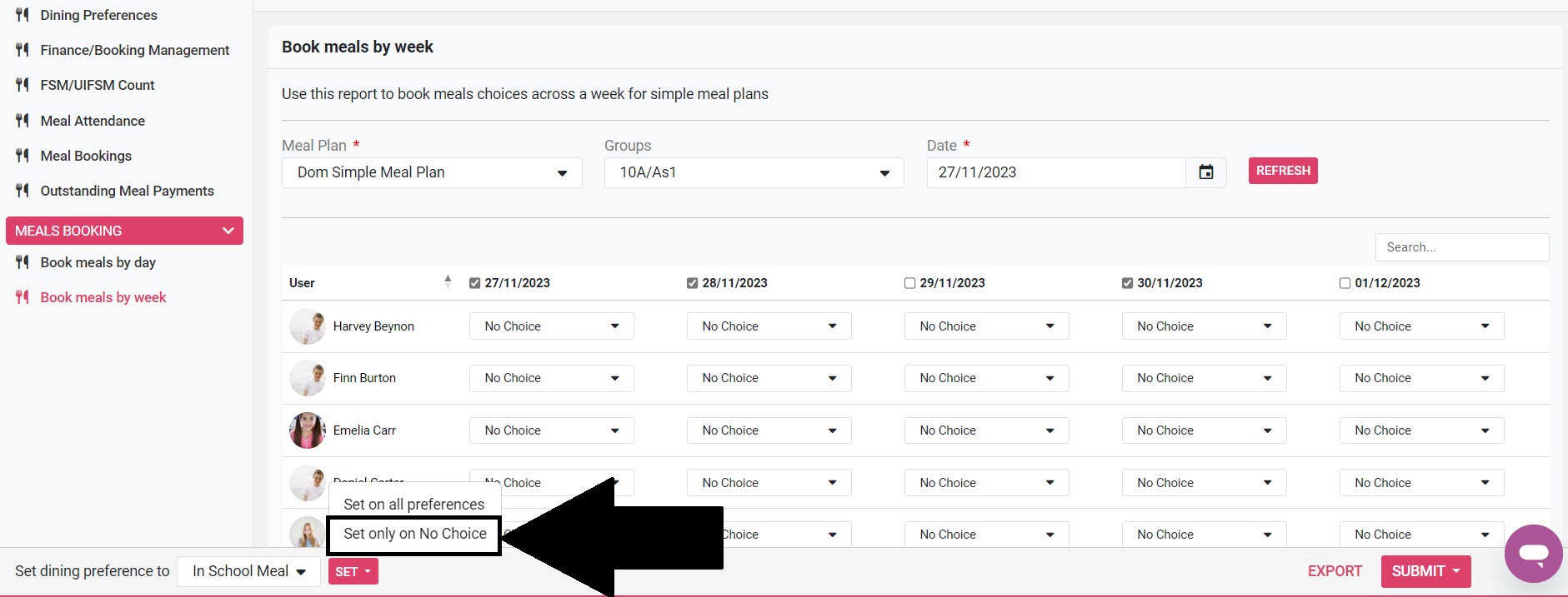 13 b) If you only want to apply this dining preference to the students that have No Choice on the days you have ticked, click Set only on No Choice.