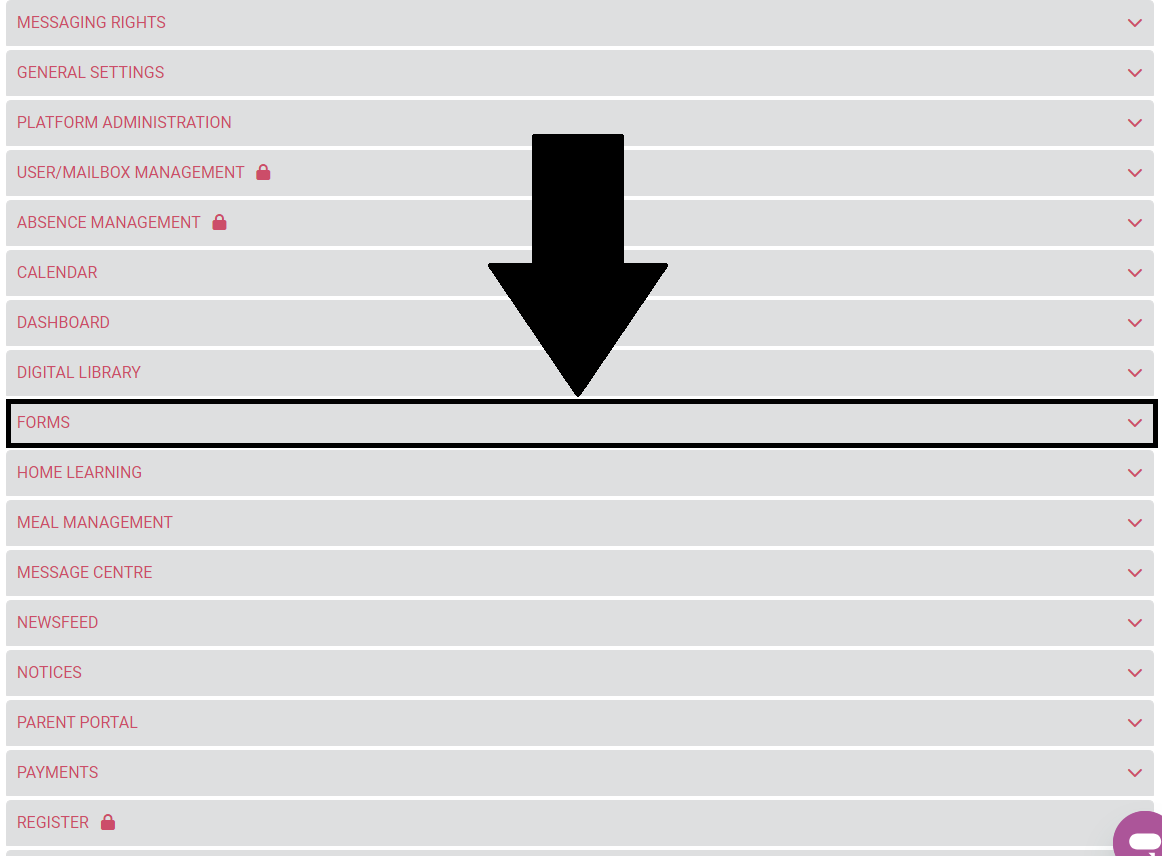 For instance: If you want to change what this role can do in the Forms area, click FORMS to reveal permissions for the forms area.