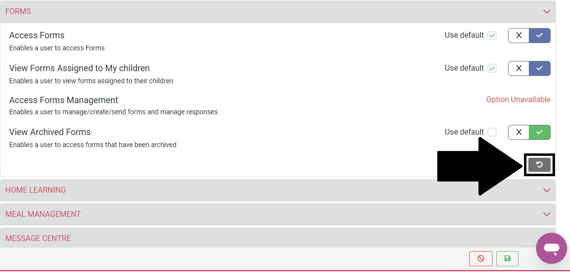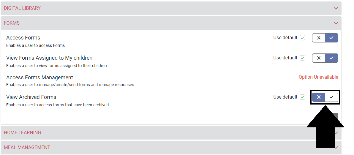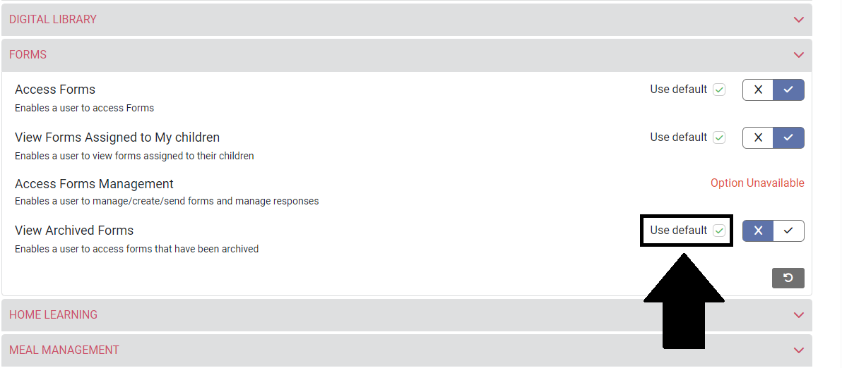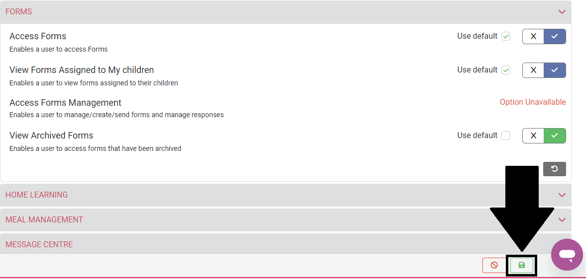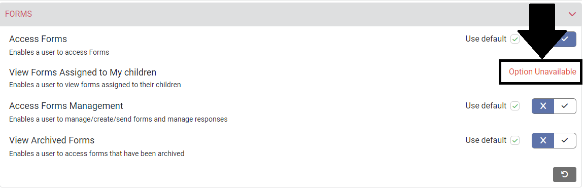 For instance, for the Teacher Role, the 'View Forms Assigned to My Children' permission is unavailable, so a teacher that has a child at the school who needs to the see forms assigned to their children would need the Parent/Carer role applied, where this permission is enabled by default.