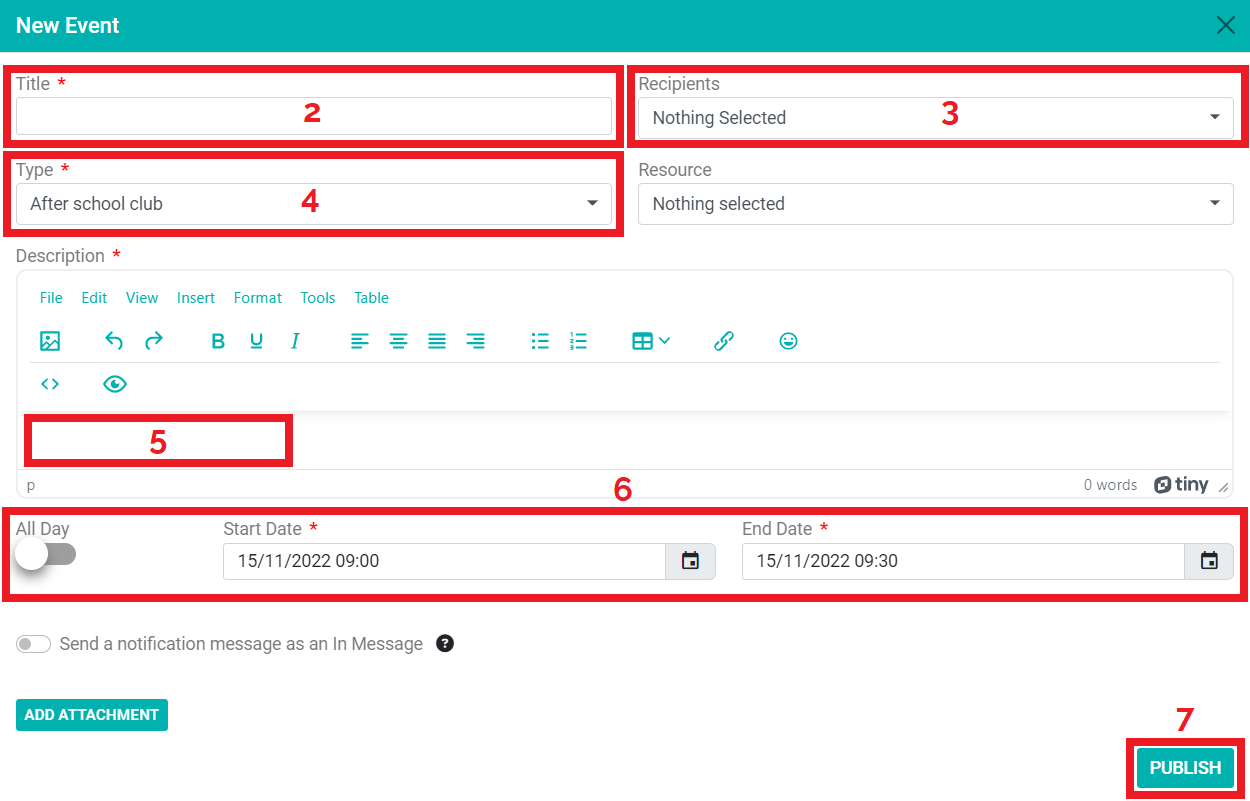 6) Click ‘all day’ to set the event as a whole day event or choose a ‘start date’ and ‘end date’ to choose the dates and times for the event.