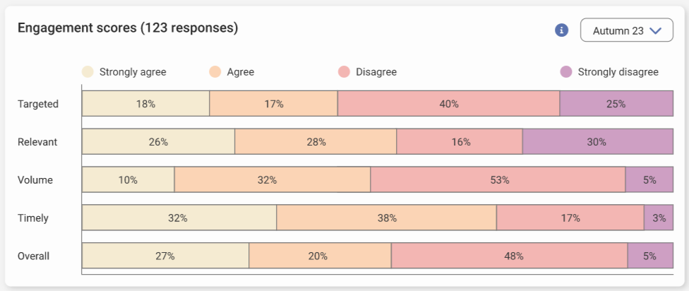 A low score here suggests that parents may be unhappy with one or more aspects of your communication, such as how well it’s targeted, its relevance, the volume of messages, or how timely they are.