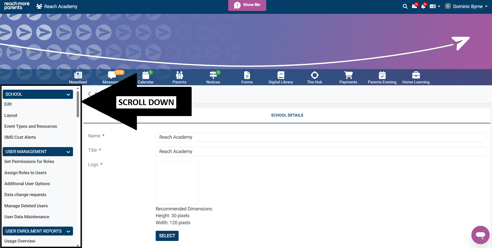 3) Click your school name to access the admin menu.