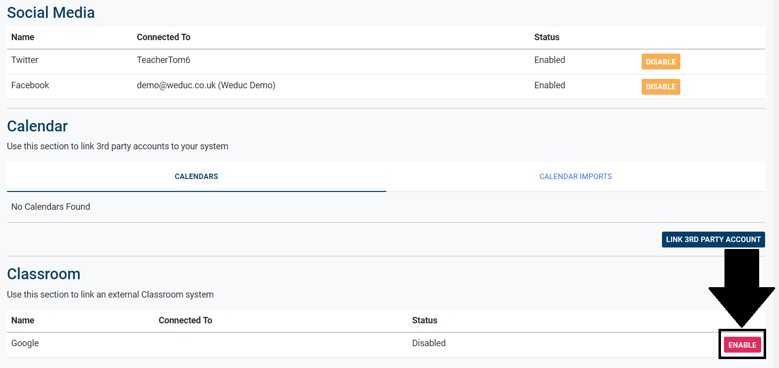 6) Scroll down to the bottom of the integrations area and Click Enable under the Classroom heading.