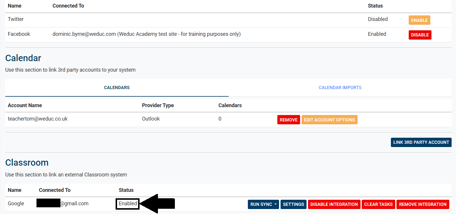 13) If this has been successful, the status will show as enabled under the Classroom heading in ReachMoreParents. An initial sync will start automatically which may take some time depending on the number of items in Google Classroom.