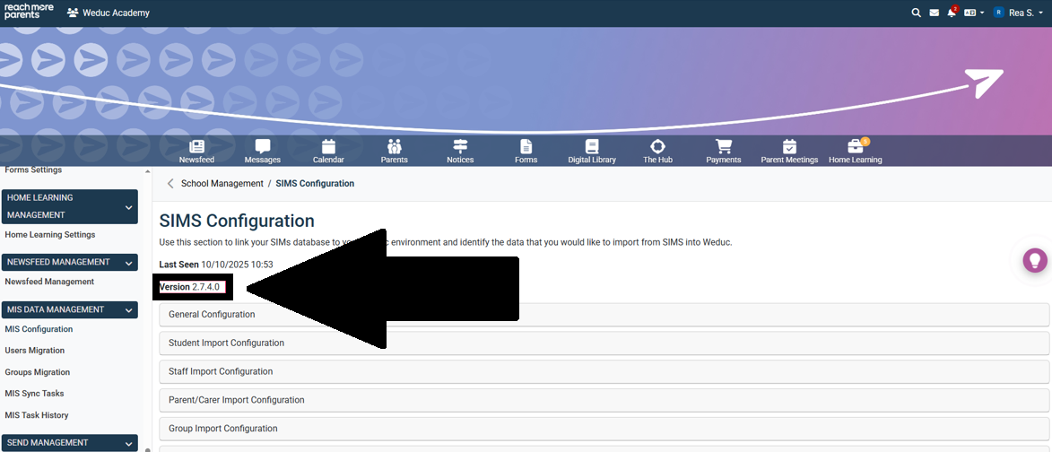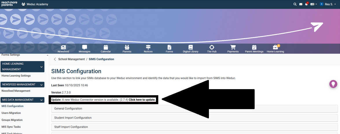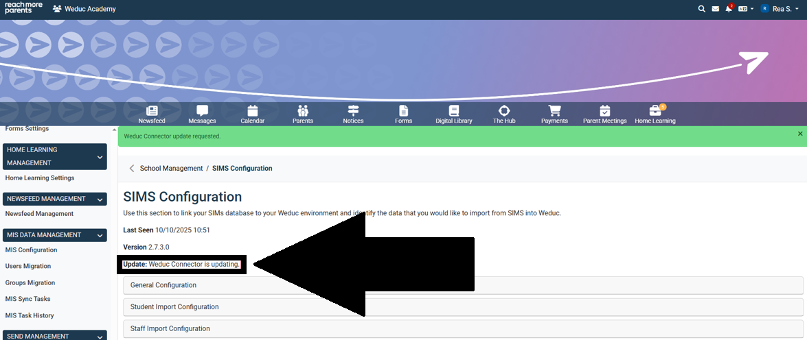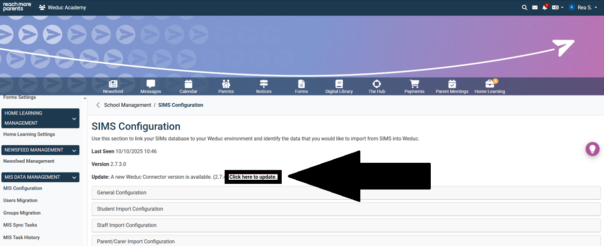 When you are notified of an update to the Weduc Connector (ReachMoreParents’ direct connection to the SIMS MIS), you will need to trigger the update of the connector from within your ReachMoreParents platform. This guide outlines the steps needed to make the update.