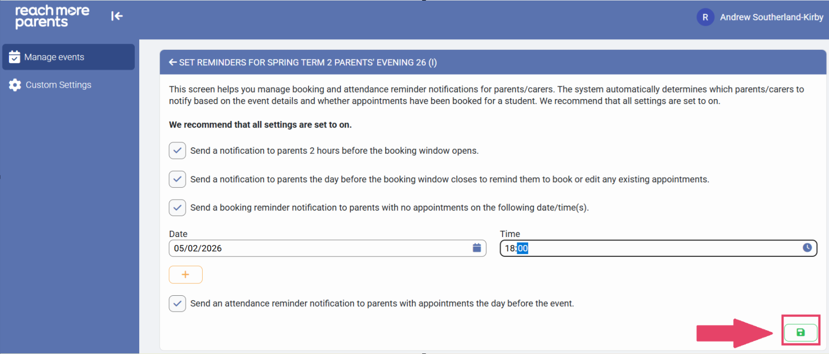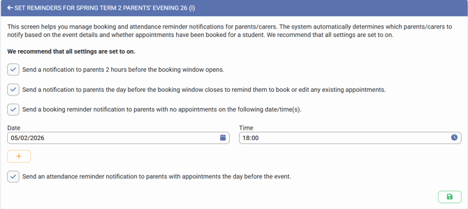 - Send a notification to parents the day before the booking window closes to remind them to book or edit any existing appointments