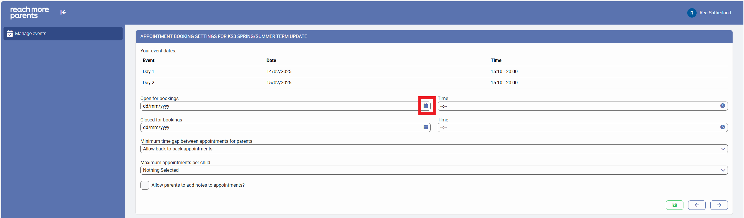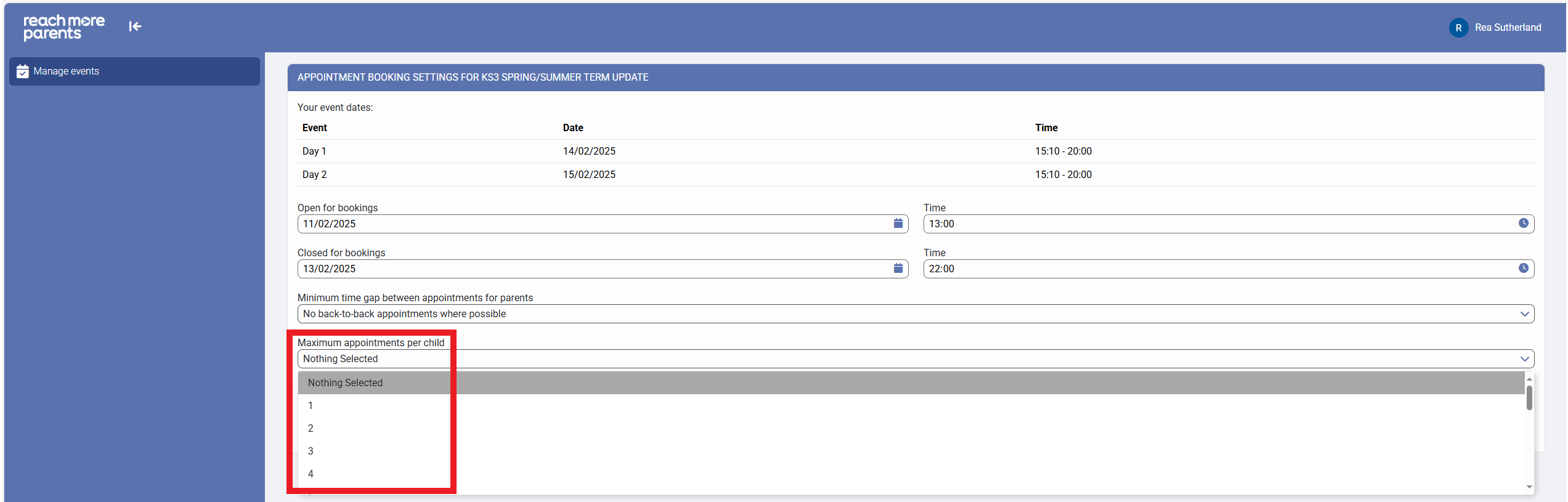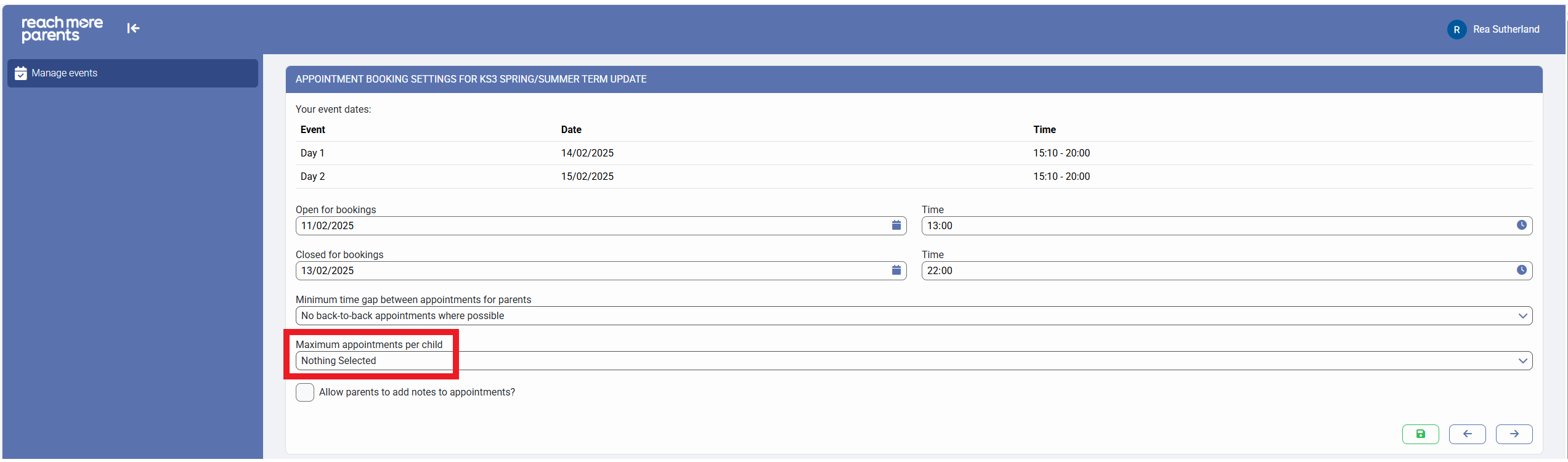 6) Click on the "Maximum appointments per child" settings and choose how many appointments you would like to limit each child's parent / carer to when booking