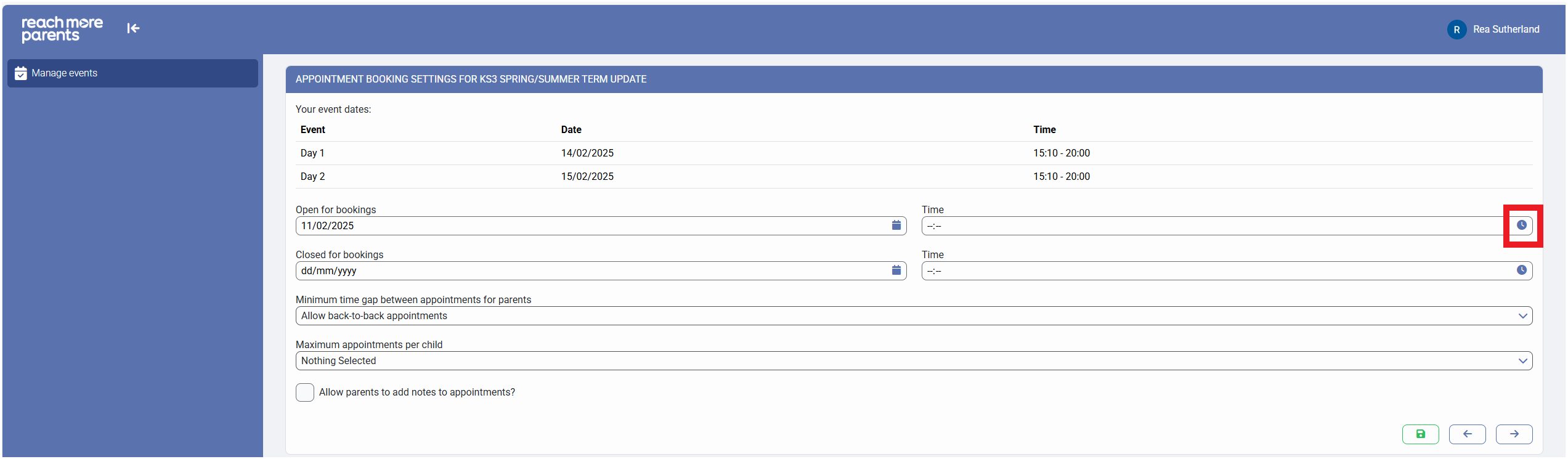 2) Click on the "Time" clock icon to use the hour and minute selector to define the booking window start time