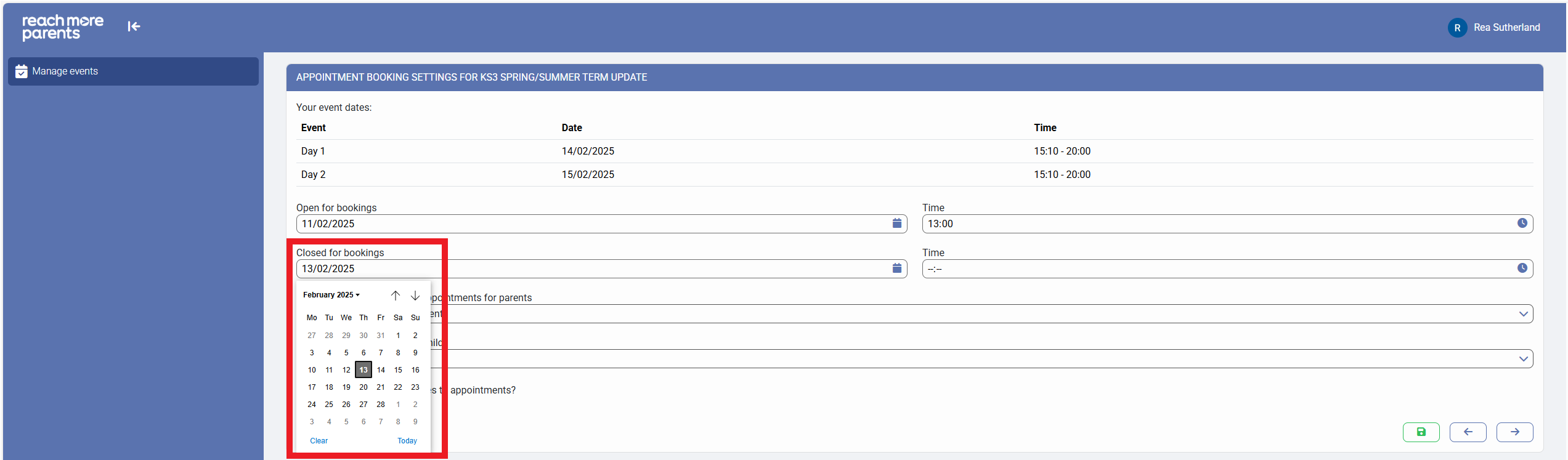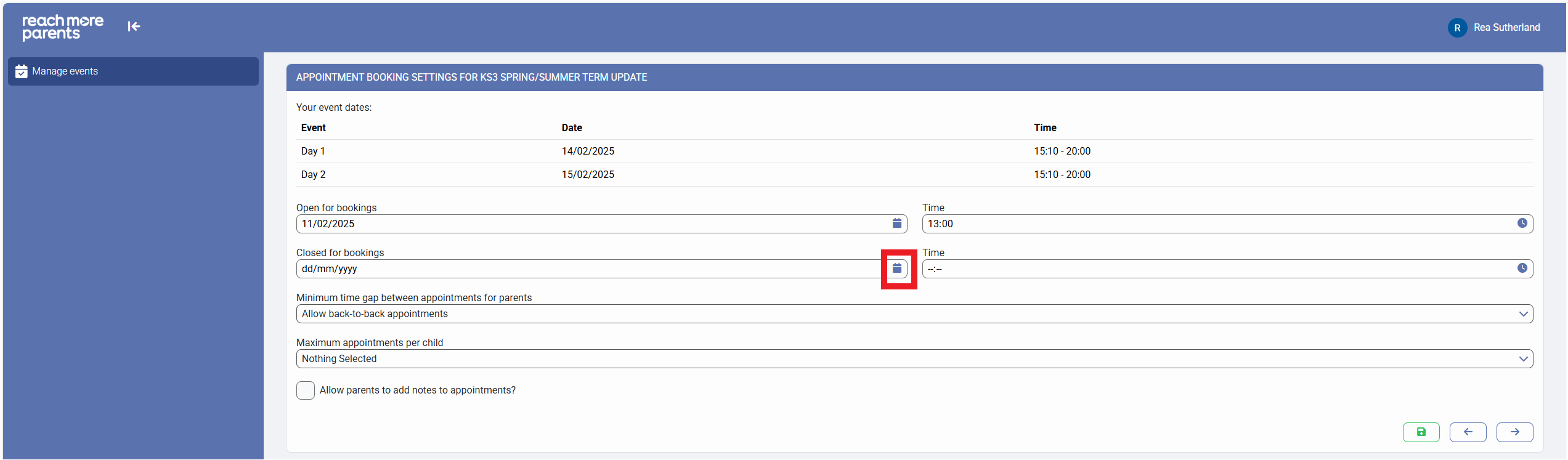 3) Click on the "Closed for bookings" calendar icon to use the calendar selector to choose the Booking window close date