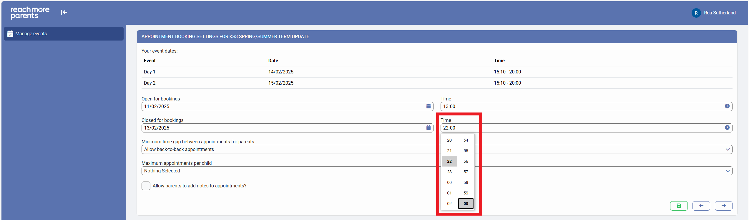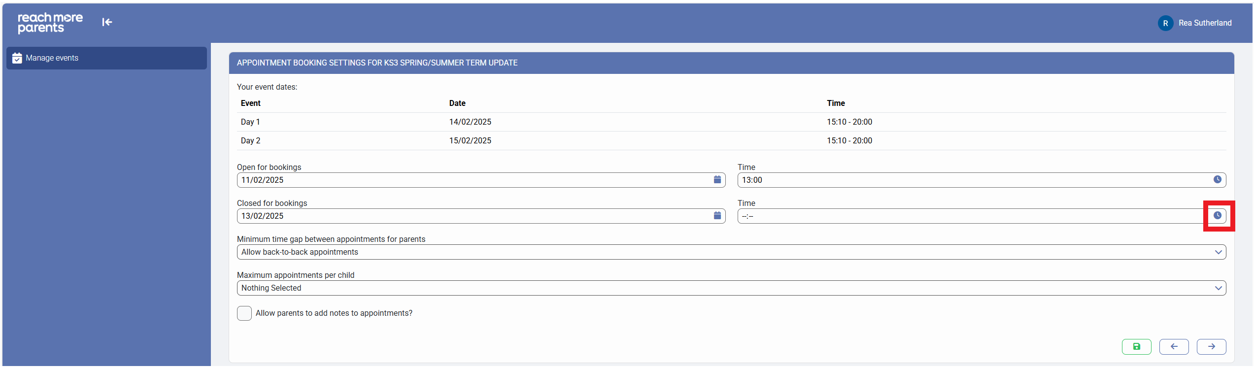 4) Click on the "Time" clock icon to use the hour and minute selector to define the booking window end time