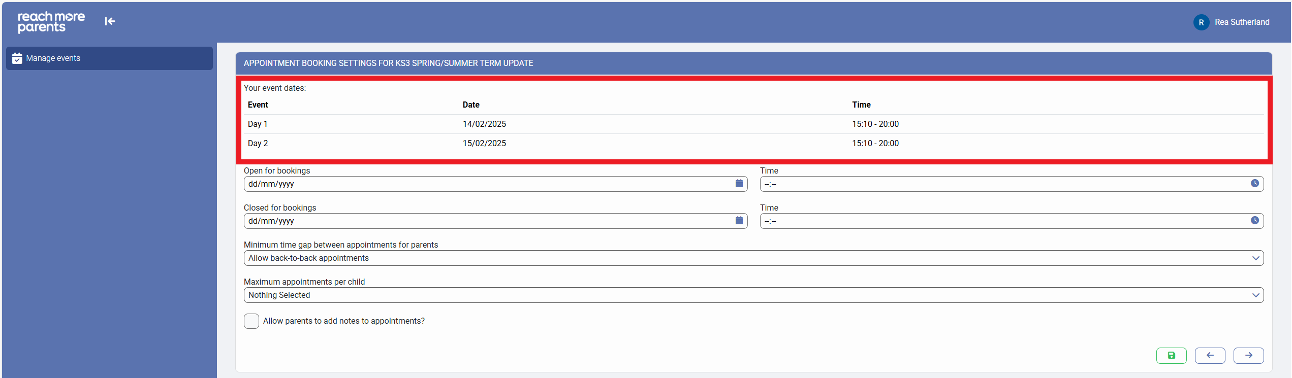 We have aimed to help with the process on this screen by displaying the Event Date(s) and Time(s) in the header of the screen for your review: