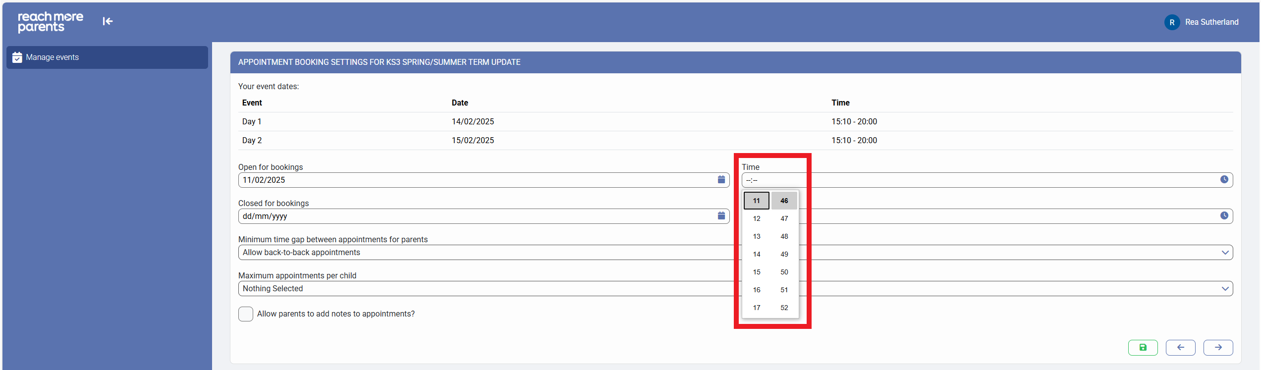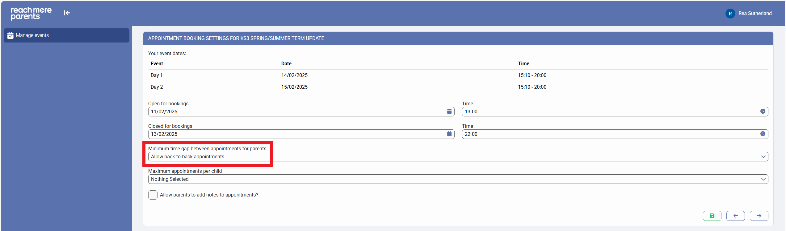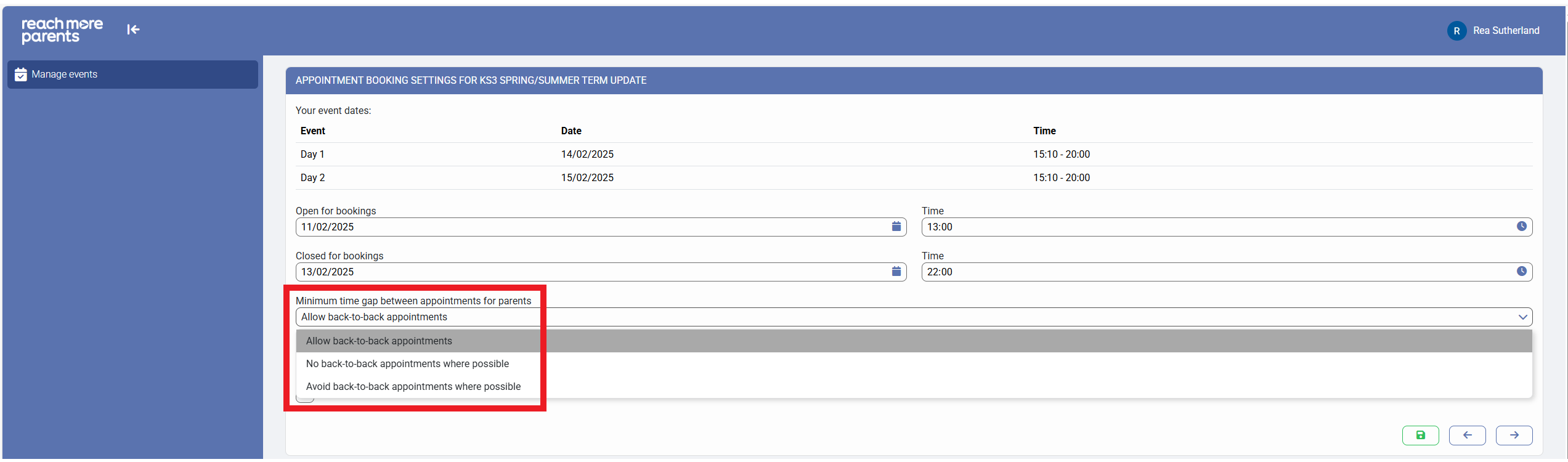 5) Click on the "Minimum time gap between appointments for parents" to choose whether to "Allow back-to-back appointments", "No back-to-back appointments where possible" or "Avoid back-to-back appointments where possible"