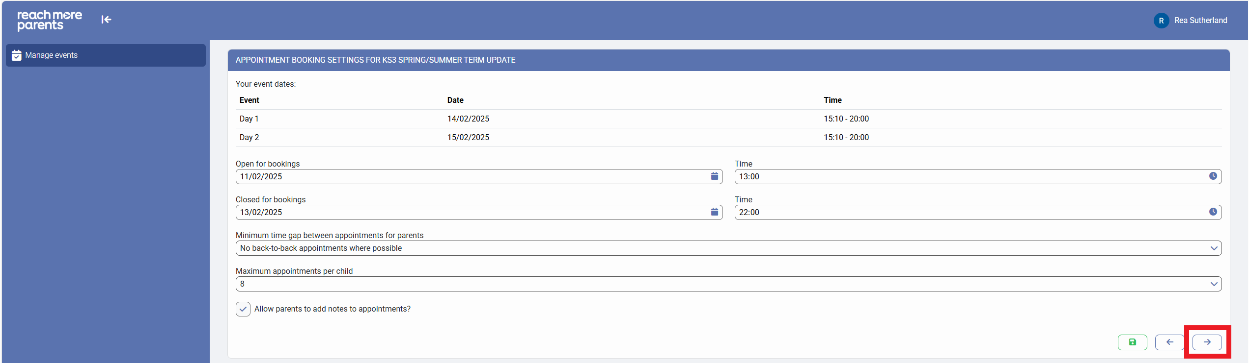 8) Click on "Next" to automatically save your progress and proceed to the next screen for creating your Parents Evening event