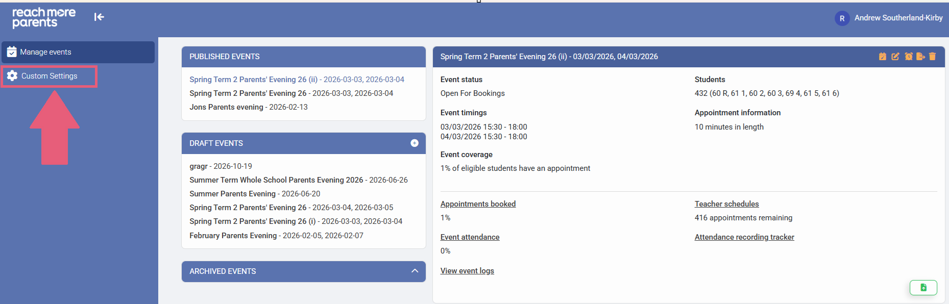 To manage the situation where Parent / Carers for a child cannot attend the same appointments, we have created a time saving setting which ensures that no matter how many events you create, you have a setting that's retained for all events.