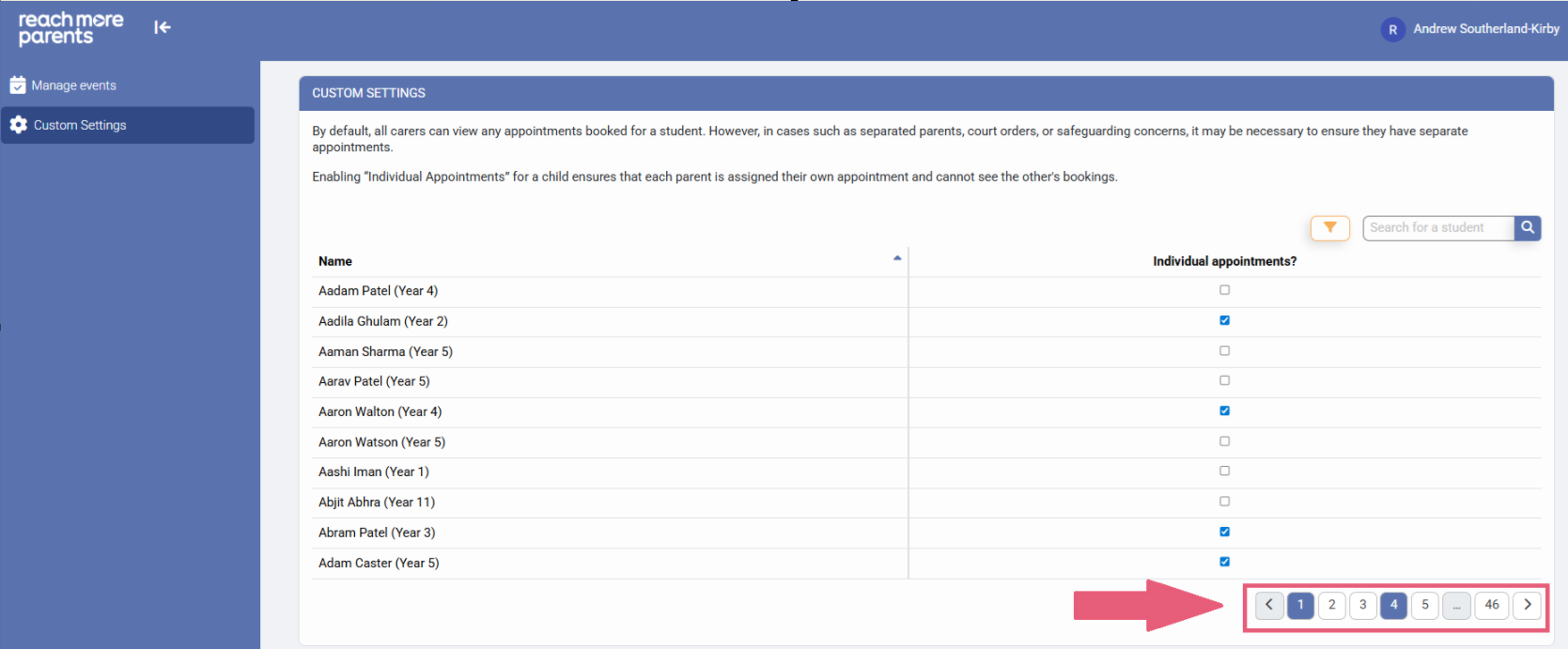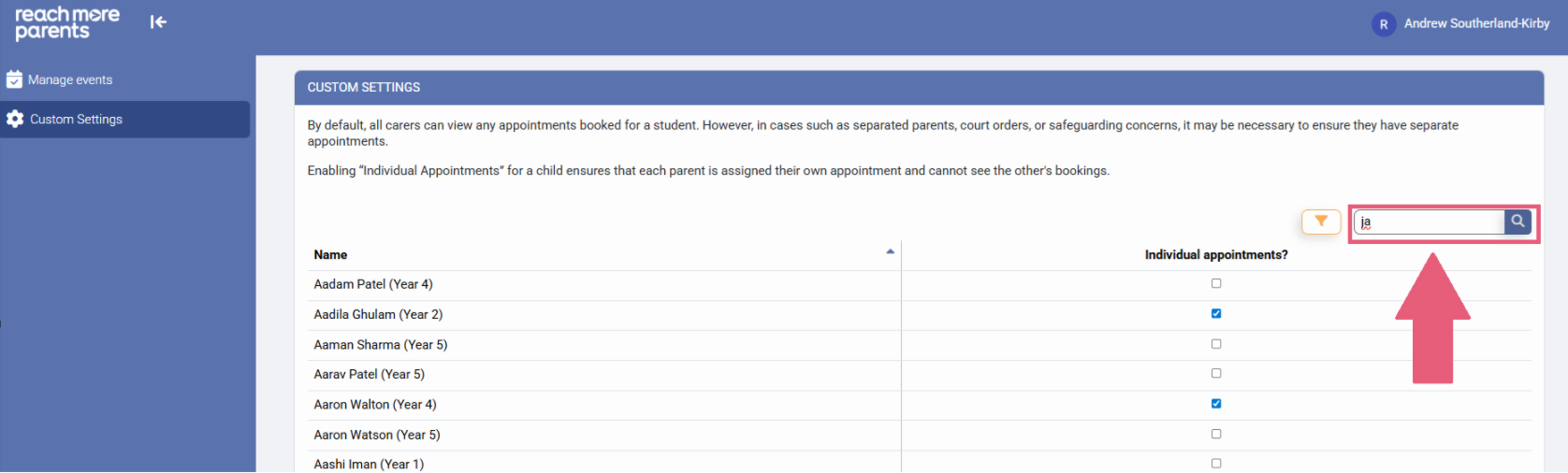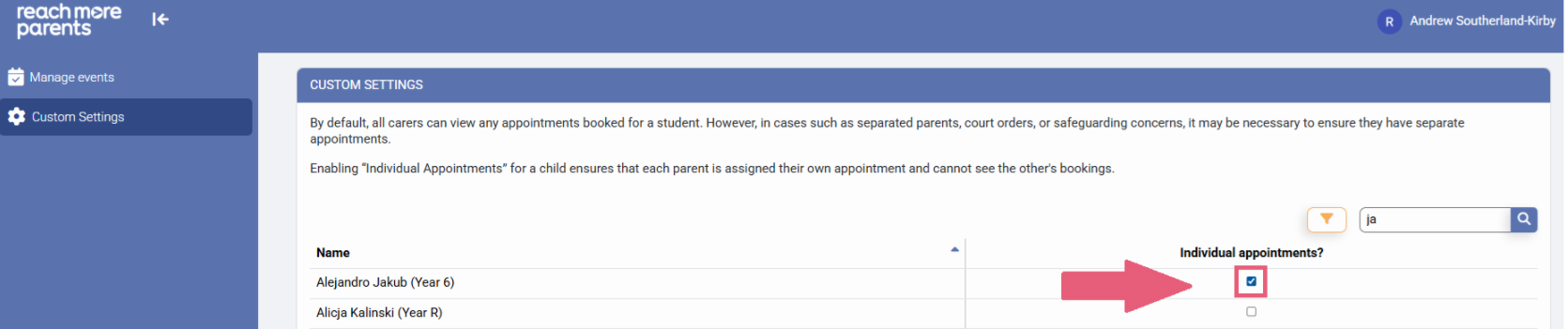 4) Click the check box against that Student's name and you're all set. Now, when these parents access Parent Meetings on the ReachMoreParents App, they will be booking their own individual appointments