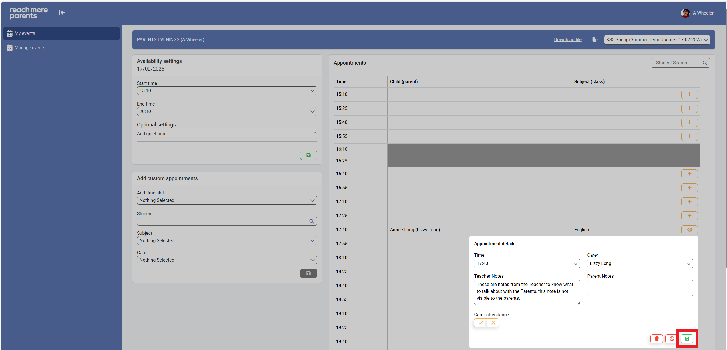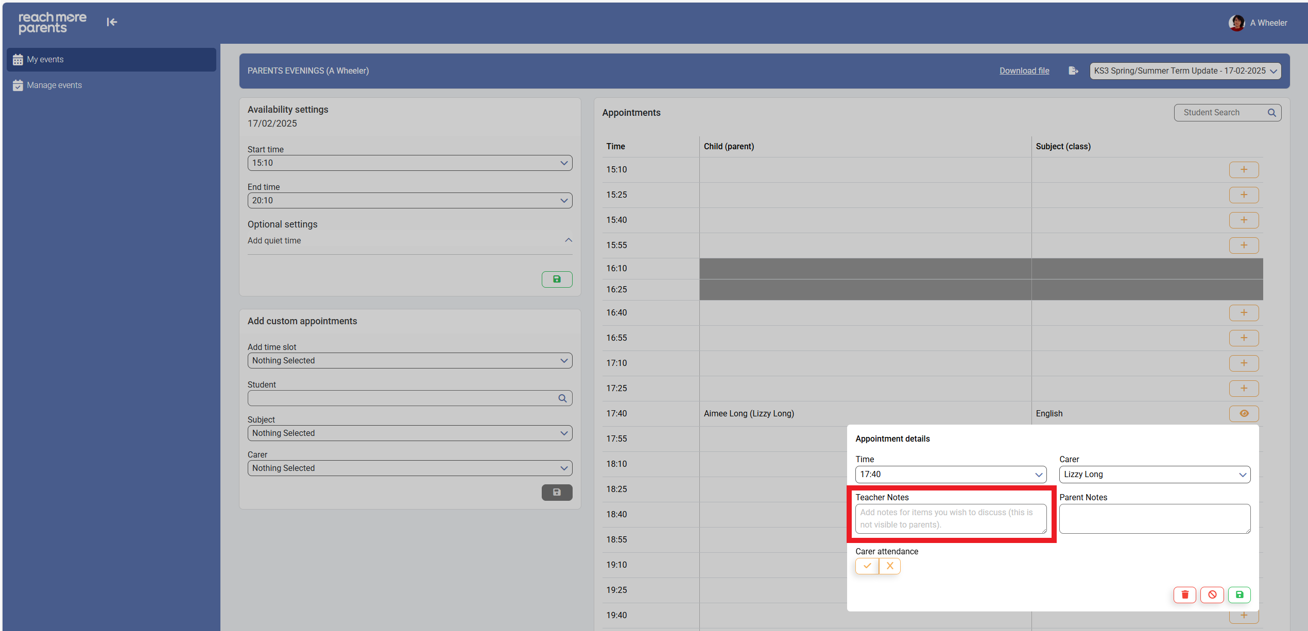 Sometimes, we have specific things that we need to discuss with a Parent / Carer during an appointment with them. Within the Appointment Details screen, you can add a note to remind yourself of key talking points without the parent being able to see these musings prior to the appointment.