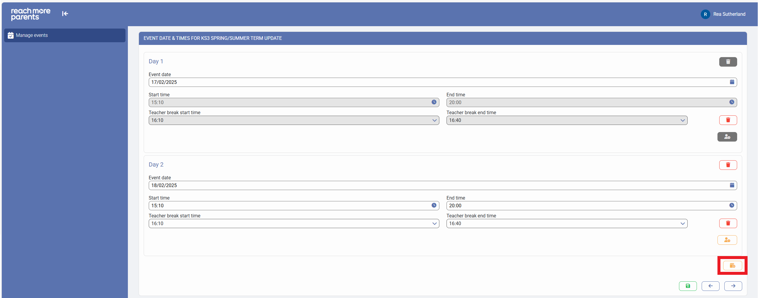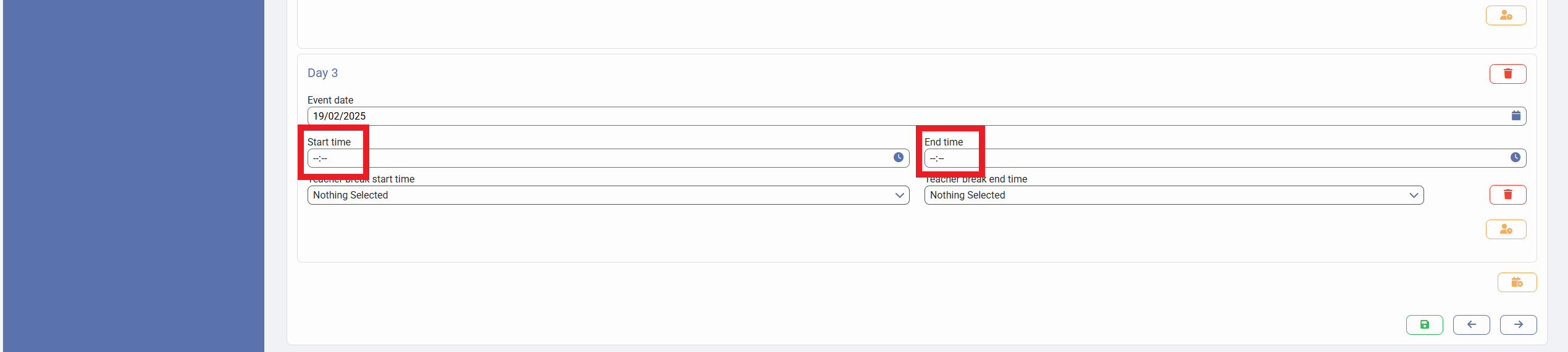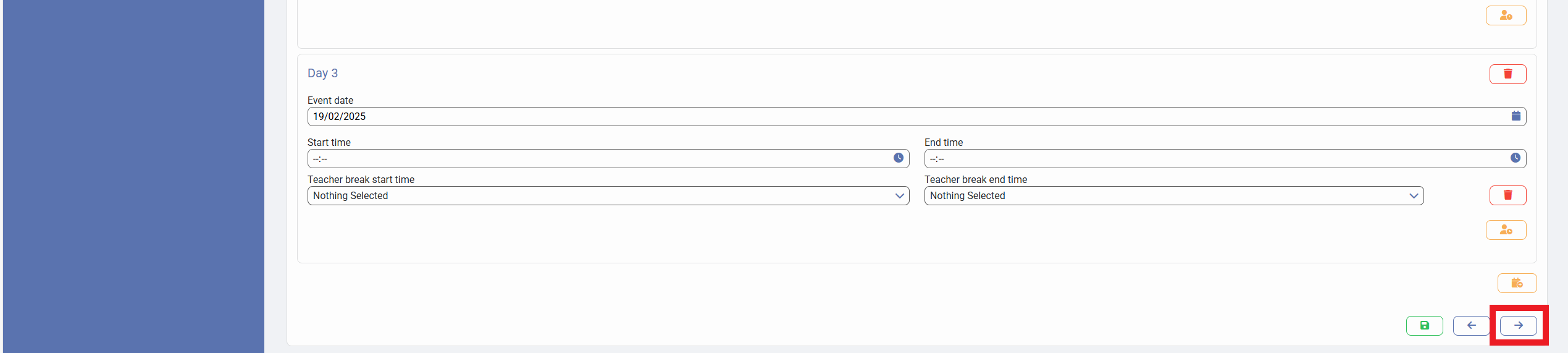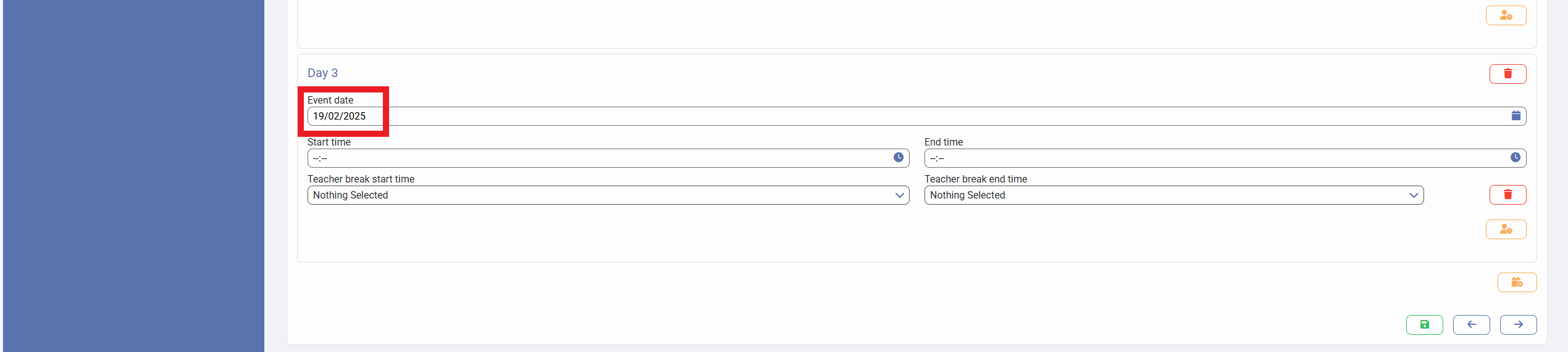 6) Click on "Add another day" which will add another event date configuration block with the "Event date" field pre-populated to the day after the preceding date i.e. if date was 18/02/2025 the new Event Date will auto populate as 19/02/2025
