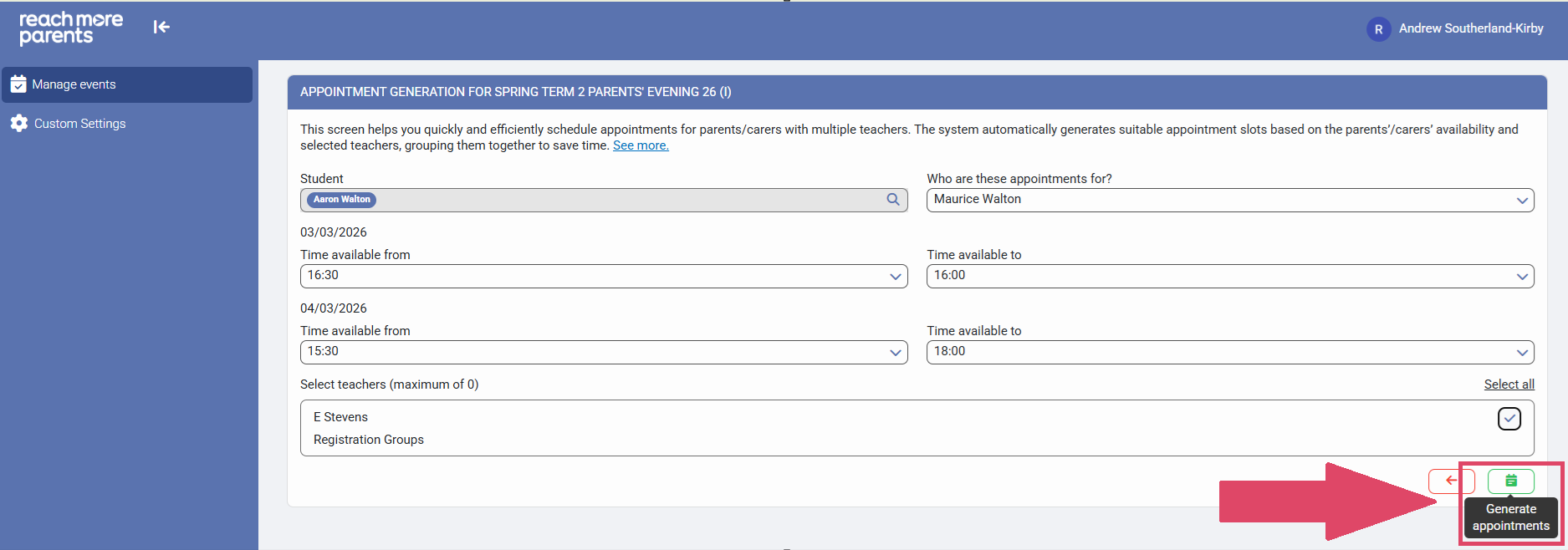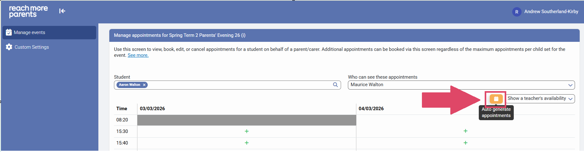 14) Click on "Auto Generate Appointments" to create the appointments automatically for this one Parent/ Carer