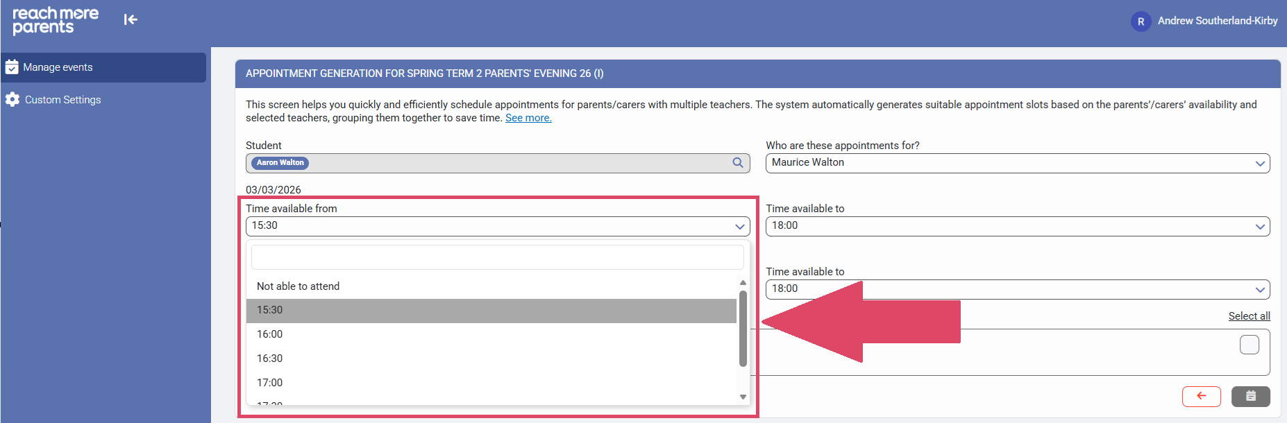 9) Click on "Time available from" to assign the start of the Parent/Carers availability for Event Date 1 (if more than one event date exists)