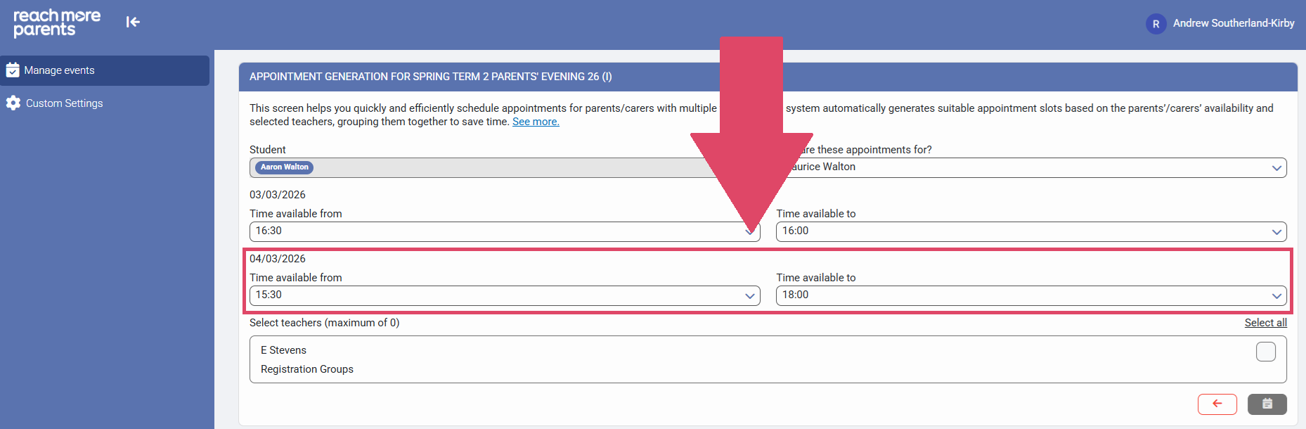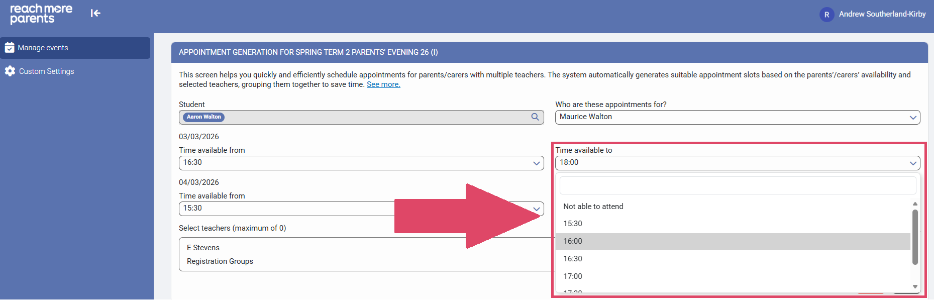 10) Click on "Time available to" to assign the end of the Parent/Carers availability for Event Date 1 (if more than one event date exists)