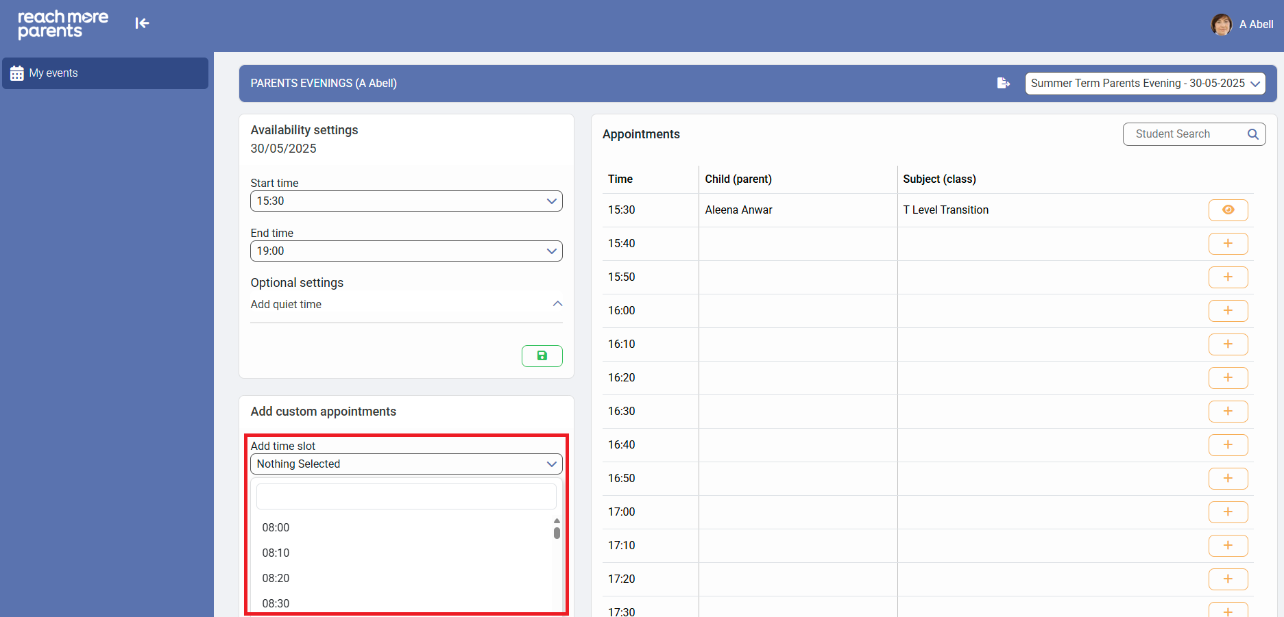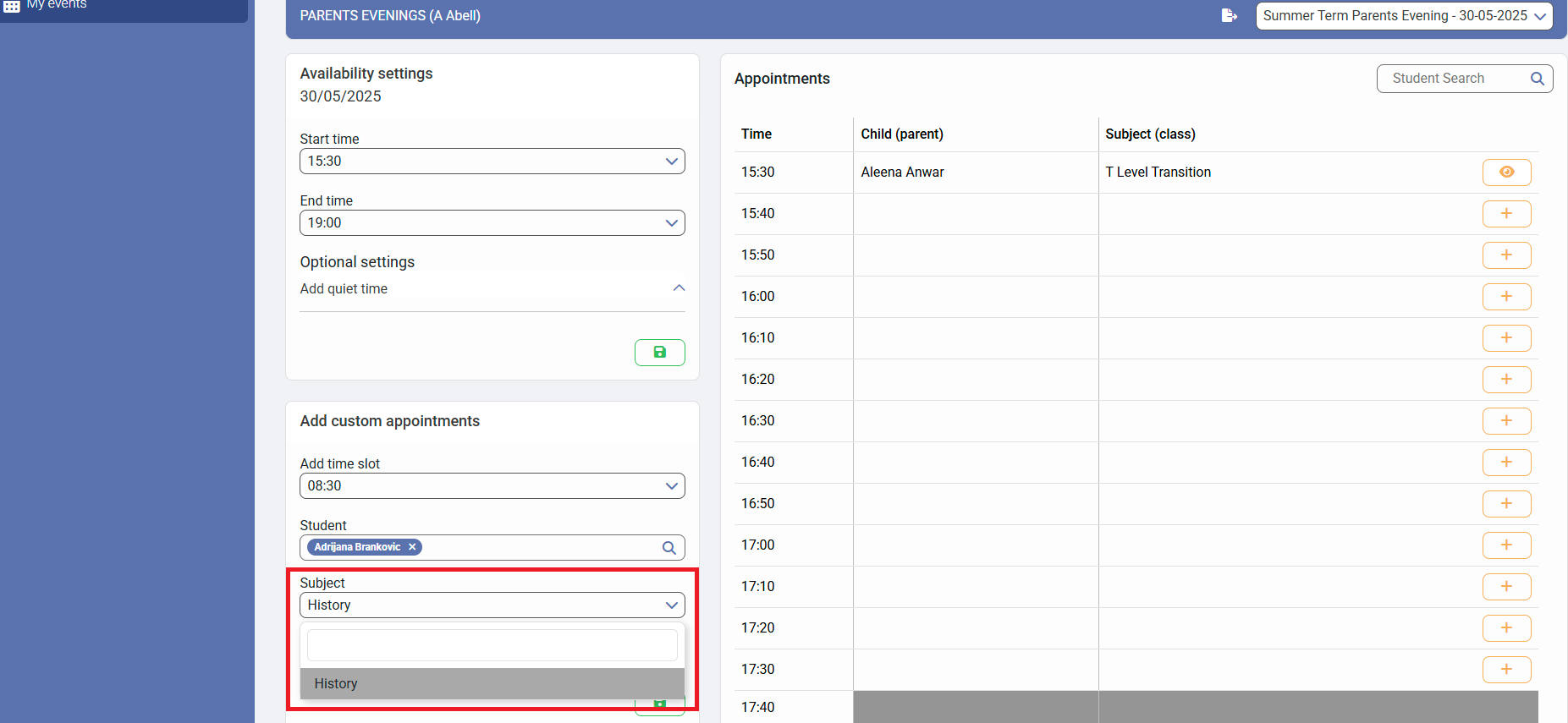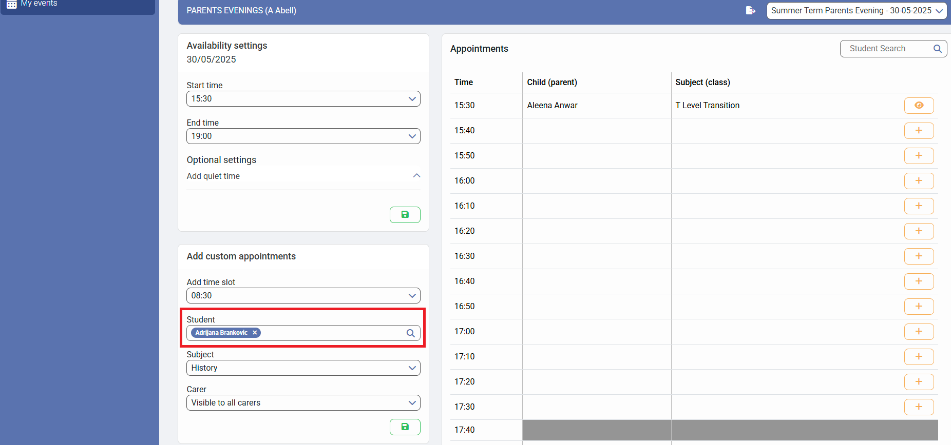Sometimes, a Parent / Carer isn't able to attend an event in the standard booking window the School Administrator has defined (perhaps they work a night shift so can only attend in the morning). In this circumstance, you may agree with that Parent / Carer to an appointment outside of the event date time window.