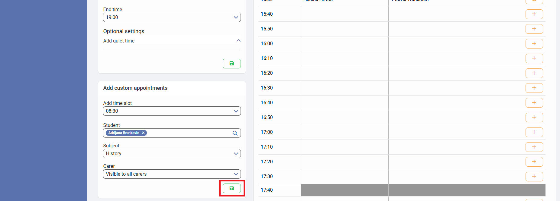 8) Click on "Save" in the "Add custom appointments" block to accept your changes