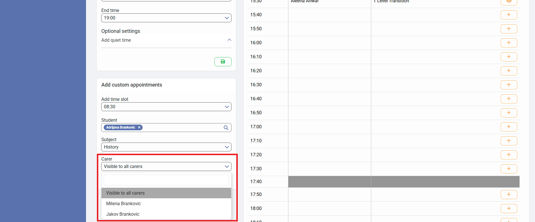 7) Click on the "Carer" field and choose whether it is "Visible to all carers" or choose the carer the appointment is for