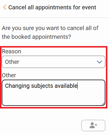 3) Select 'Cancel all appointments for the event', select 'Other' as your reason and then type in the reason in the text box. Finally, click on the image of the person with a cross at the bottom.