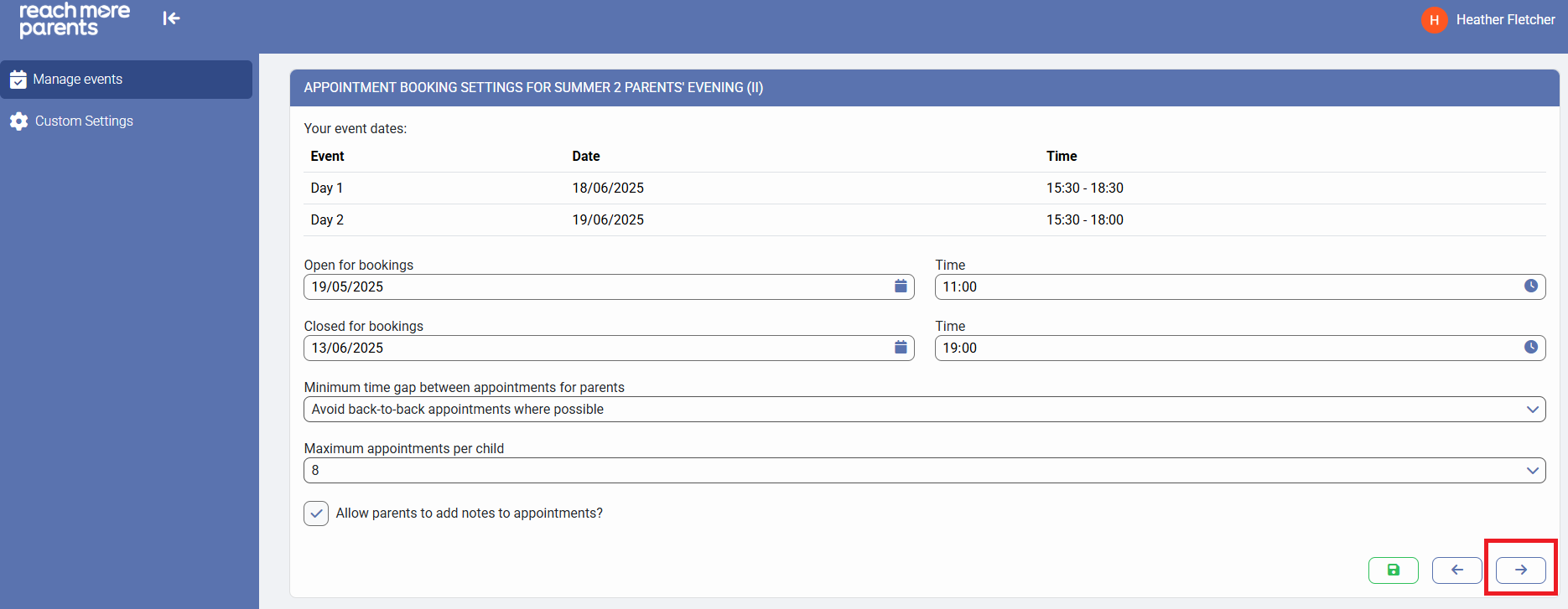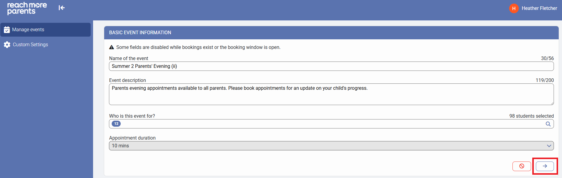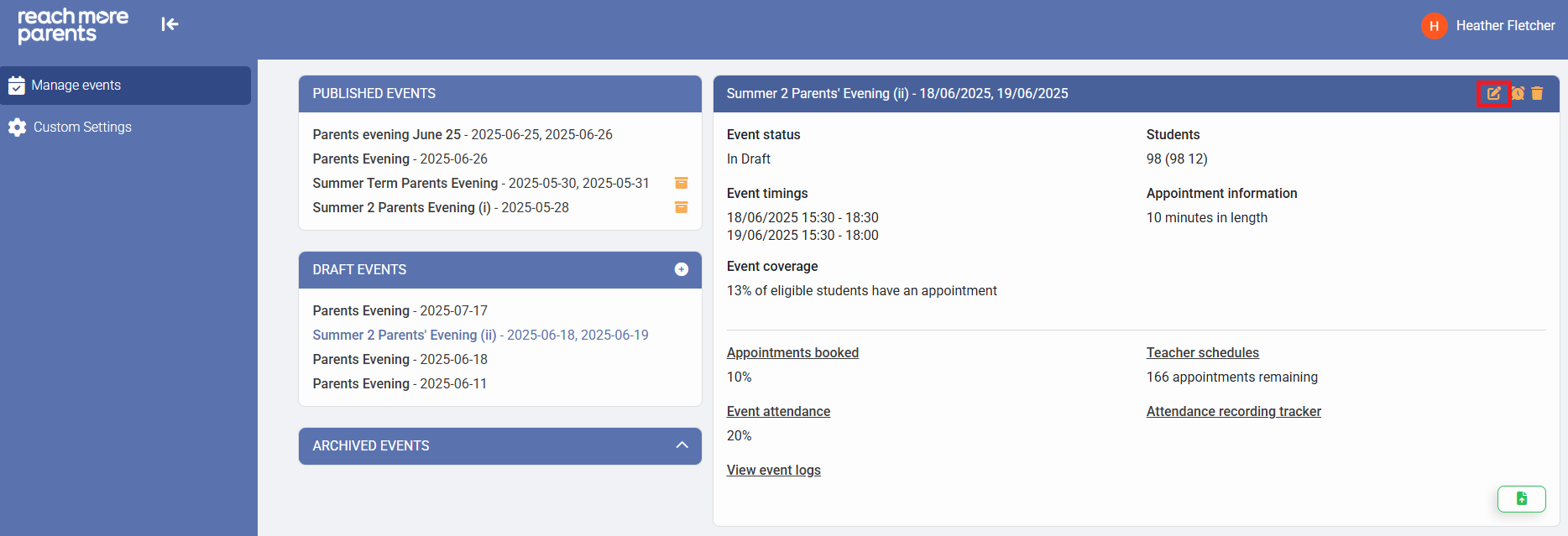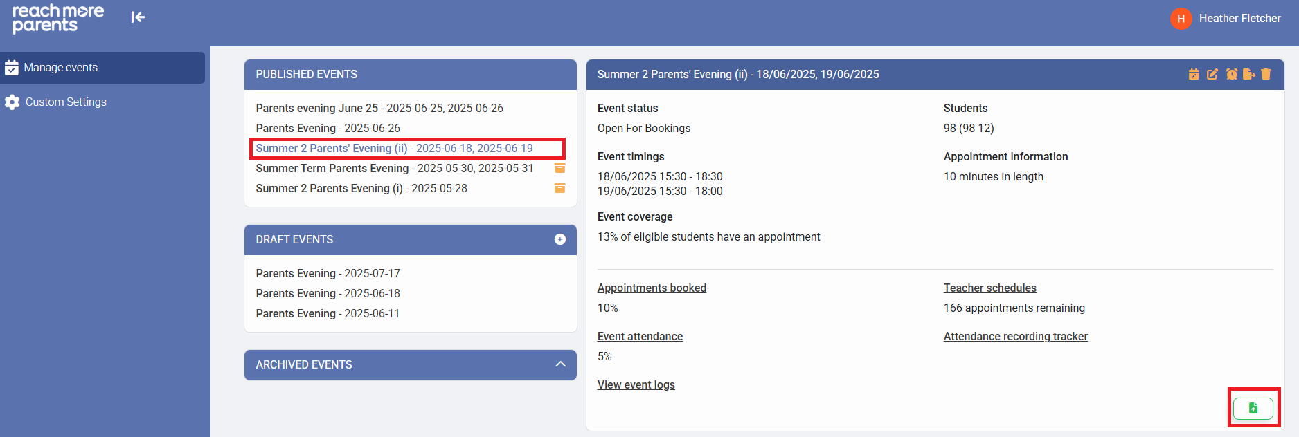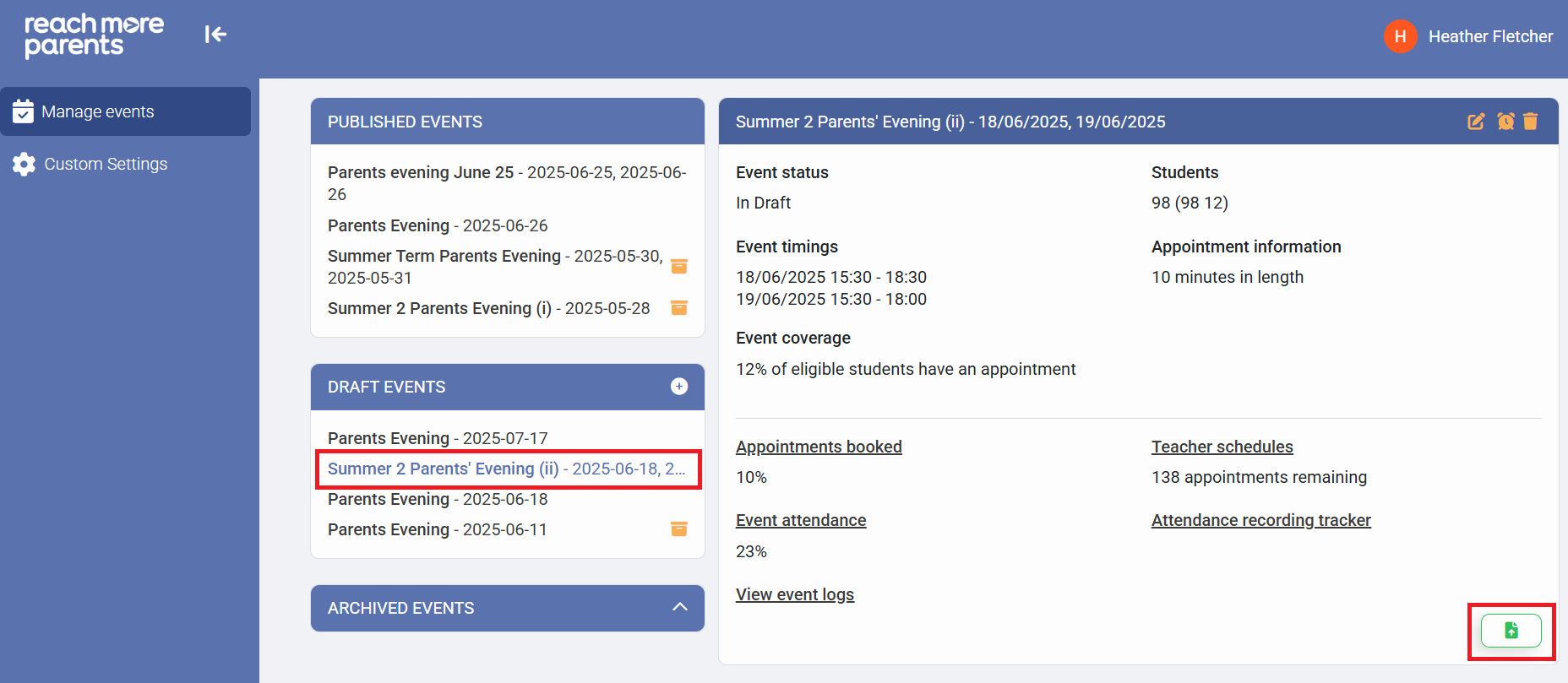 18) Once saved, you will need to publish your parent event to allow parents to continue booking. To do this, select the parent event from the "Draft Events" block and the click the green "Publish Event" icon.