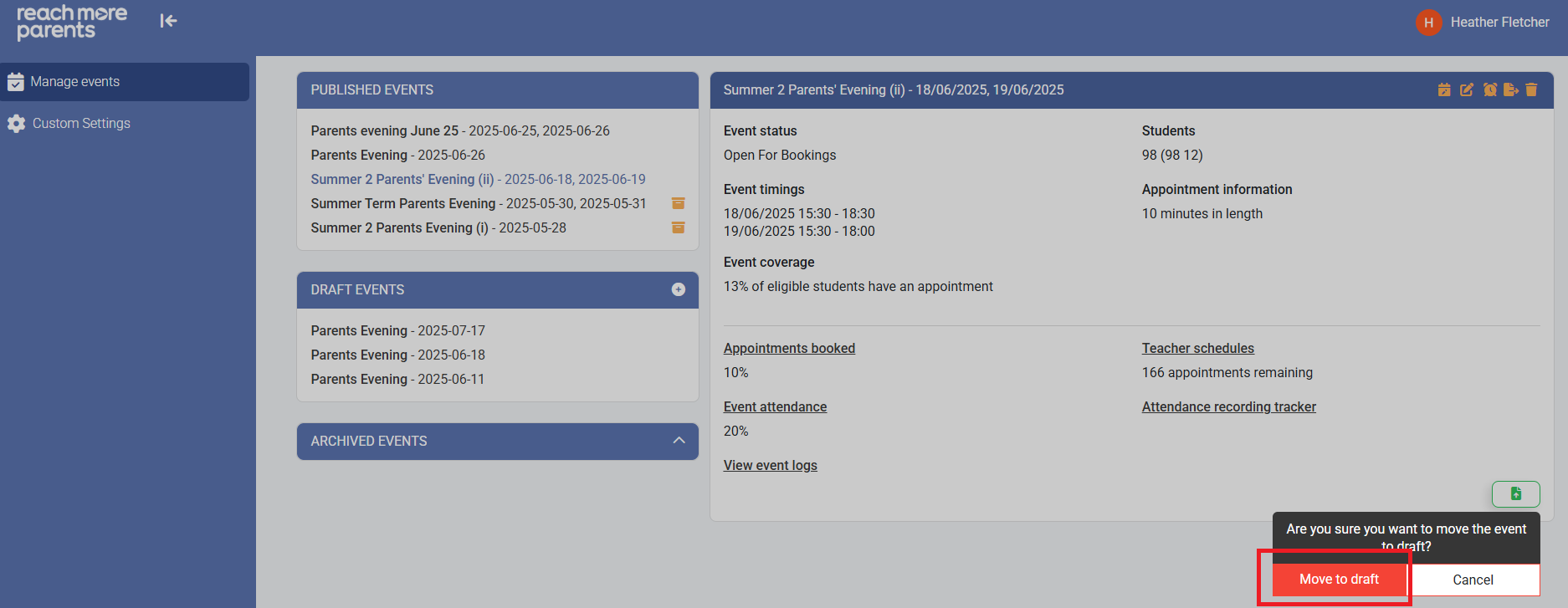If your parent event has already been published, you will need to move it to "Draft Events" before you can make any changes to teaching staff. Please follow the steps below to find out how to do this.