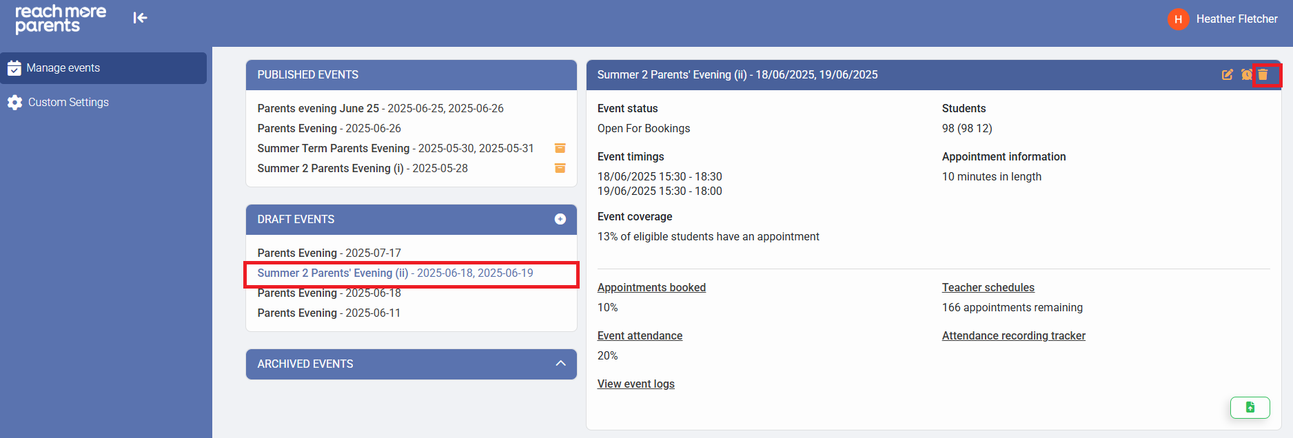 3) Once you have moved the event, click on the event name again in the drafts section and then click the bin icon.