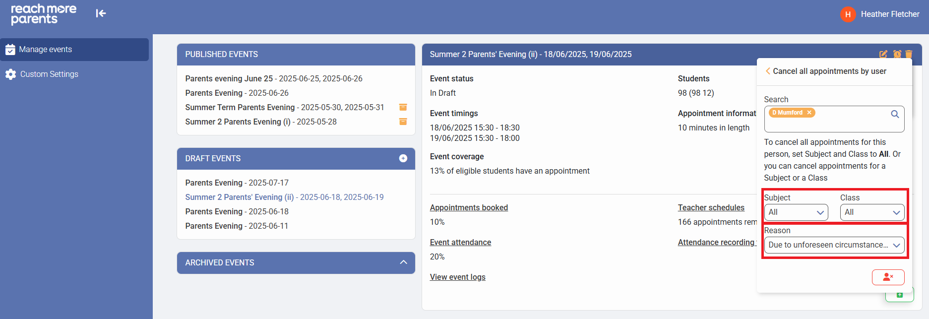 6) Select the subject(s) and class(es) you wish to cancel appointments for, along with a reason why the teacher can no longer attend.
