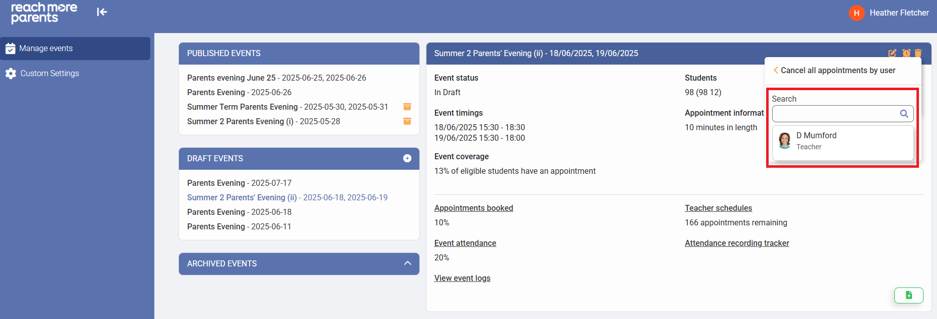 Now you have cancelled all relevant appointments for the original teacher, you can remove them from the parent event and add a substitute teacher in their place. To do this, please follow the steps below: