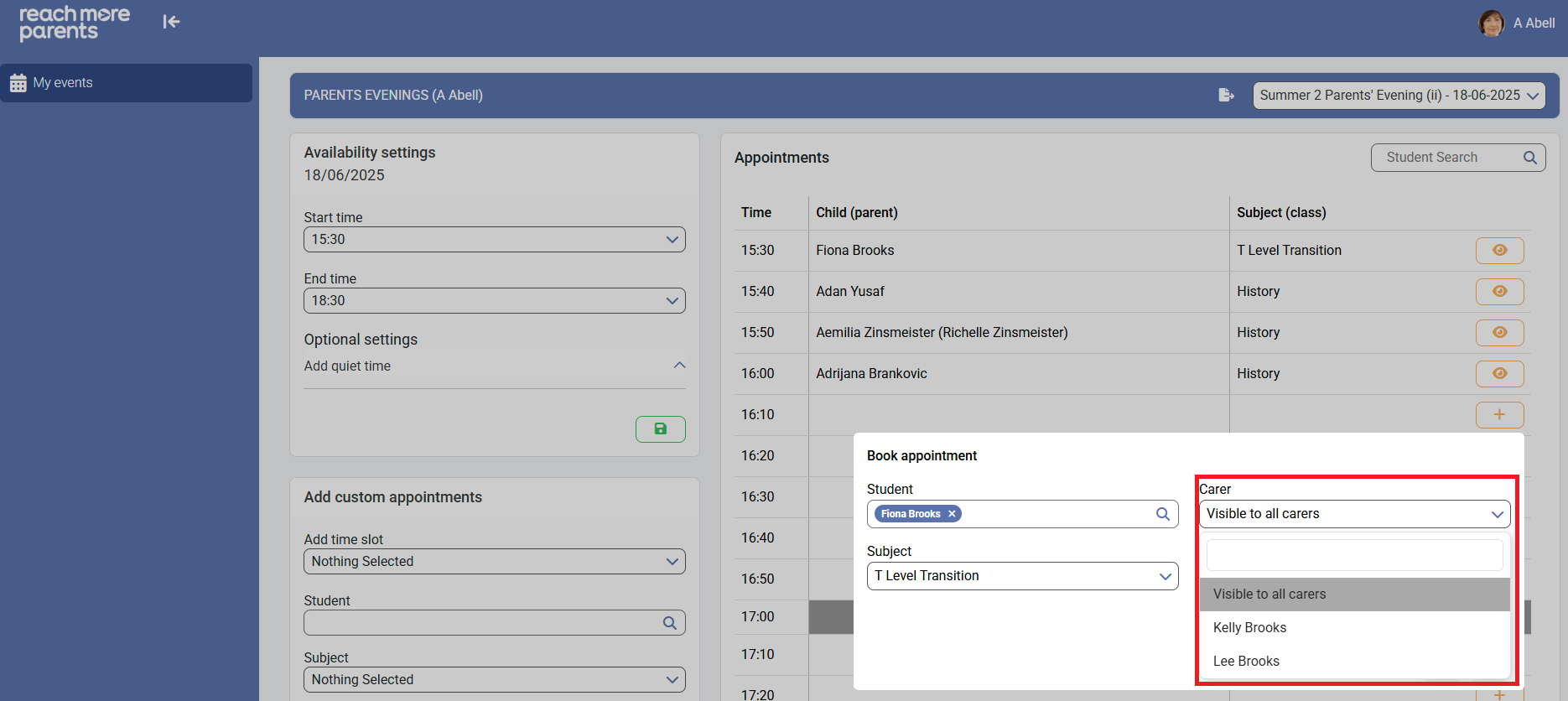 6) Click on the "Carer" selector and choose the carer you wish to make the appointment visible for. You can make the appointment "Visible to all carers" or, in the event that you need to book an appointment for an individual parent, you can select the specific parent the event is for.