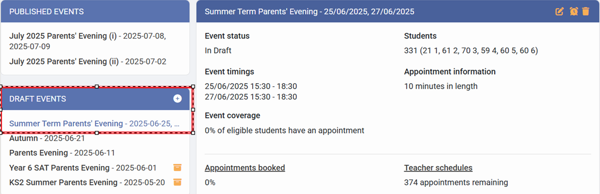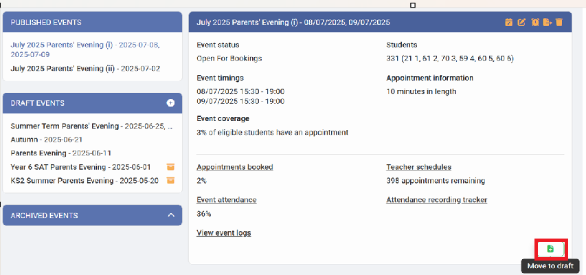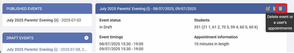2) Once you have moved the event click on the event name again in the drafts section and then click the bin icon to delete previously booked appointments.