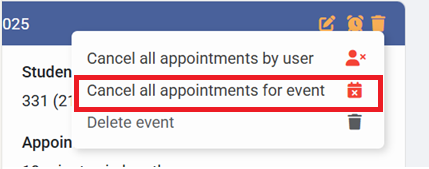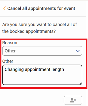3) Select 'Cancel all appointments for the event', select 'Other' as your reason and then type in the reason in the text box. Finally, click on the image of the person with a cross at the bottom.