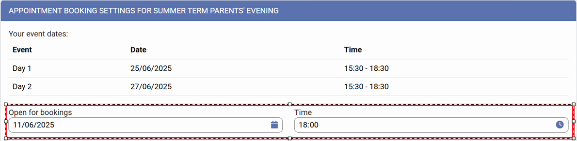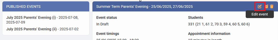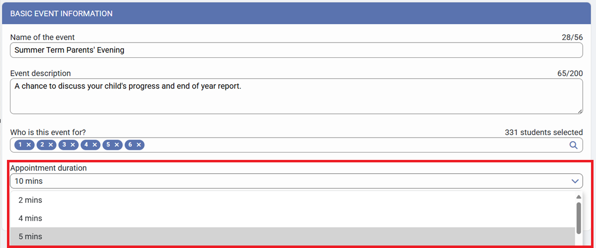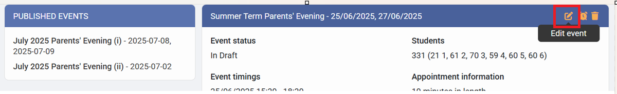 Where you have created a Parents Event, you may have decided to amend the duration of the appointments as you need them to be a little shorter (or longer) to accommodate the expected duration to cover the topics by teachers.