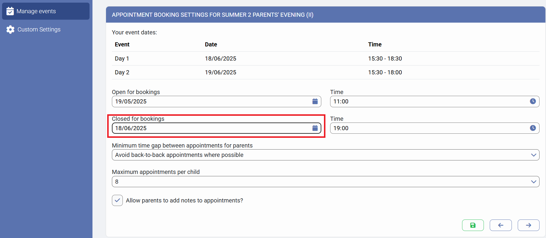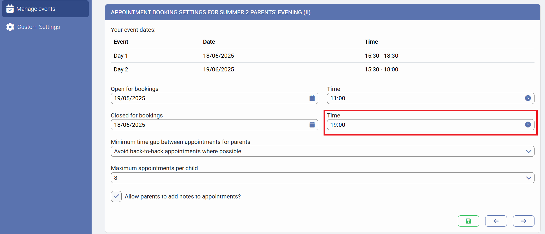 8) Click on the "Time" field for the "Closed for bookings" date field and type the new time you will be closing the booking window (if applicable)