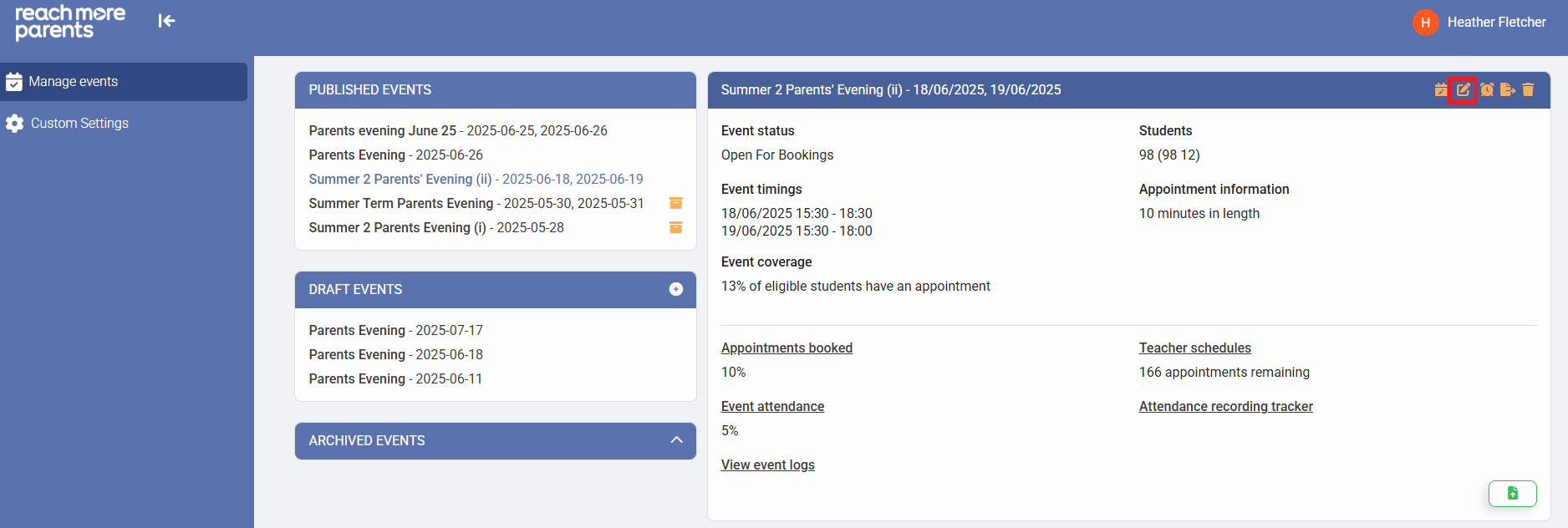 3) Click on the "Event Title" required from either the Draft or Published Events blocks